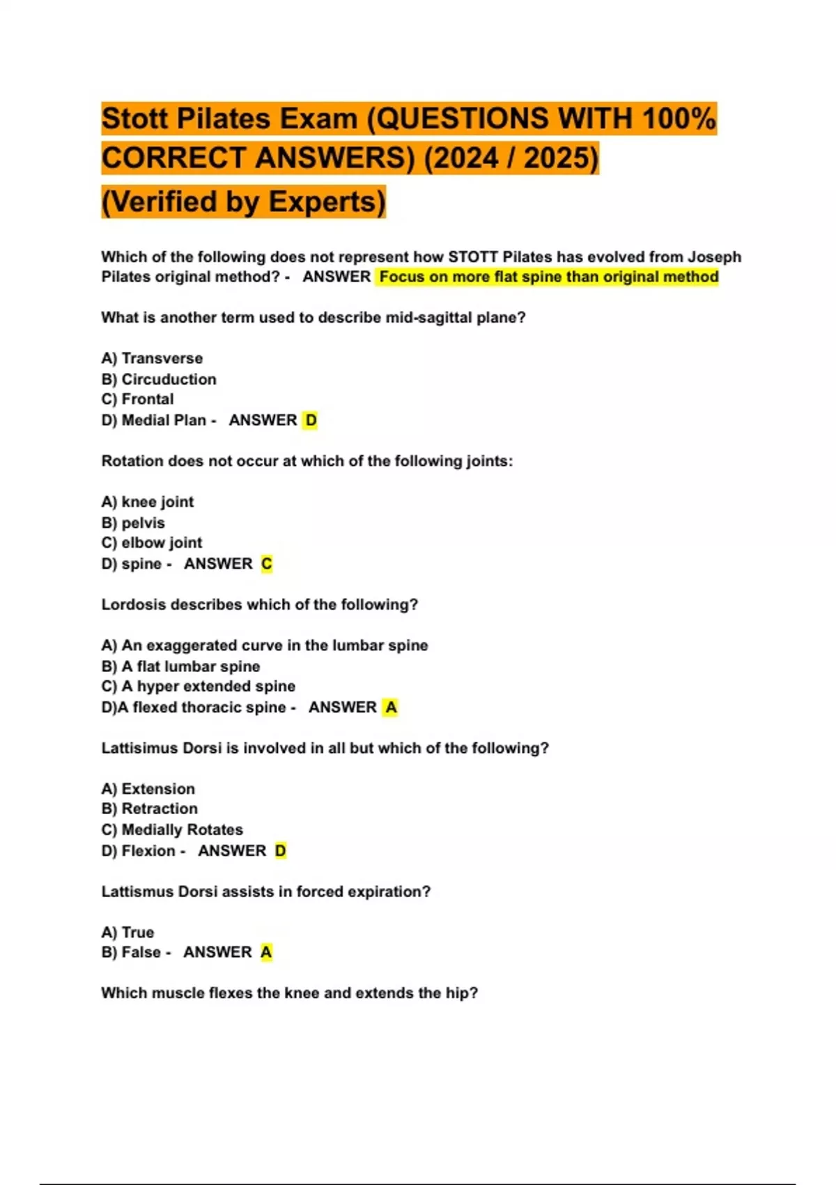 Stott Pilates Exam (QUESTIONS WITH 100% CORRECT ANSWERS) (2024 / 2025) (Verified by Experts)