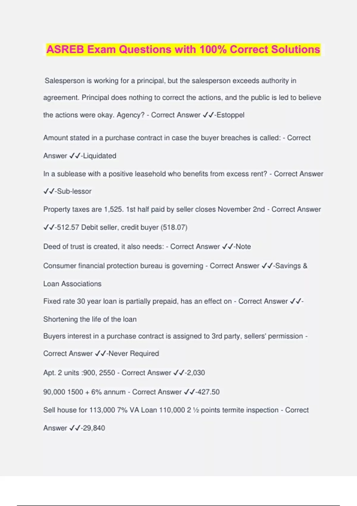 ASREB Exam Questions with 100% Correct Solutions Salesperson is working for a principal, but the salesperson exceeds authority in agreement. Principal does nothing to correct the actions, and the public is led to believe the actions were okay. Agency? - Correct Answer ️️ -Estoppel Amount stated in a purchase contract in case the buyer breaches is called: - Correct Answer ️️ -Liquidated In a sublease with a positive leasehold who benefits from excess rent? - Correct Answer ️️ -Sub-lessor Property taxes are 1,525. 1st half paid by seller closes November 2nd - Correct Answer ️️ -512.57 Debit seller, credit buyer (518.07) Deed of trust is created, it also needs: - Correct Answer ️️ -Note Consumer financial protection bureau is governing - Correct Answer ️️ -Savings & Loan Associations Fixed rate 30 year loan is partially prepaid, has an effect on - Correct Answer ️️ - Shortening the life of the loan Buyers interest in a purchase contract is assigned to 3rd party, sellers' permission - Correct Answer ️️ -Never Required Apt. 2 units :900, 2550 - Correct Answer ️️ -2,030 90,000 1500 + 6% annum - Correct Answer ️️ -427.50 Sell house for 113,000 7% VA Loan 110,000 2 ½ points termite inspection - Correct Answer ️️ -29,840 Commissioner may issue cease and desist on all but - Correct Answer ️️ -Appeal to Advisory Board Low income loans - Correct Answer ️️ -GNMA Closing statement not pro-rated - Correct Answer ️️ -Security deposit What is not required on brokerage receipt - Correct Answer ️️ -brokerage name Brokers are required to have all except: - Correct Answer ️️ -Trust Account Not appear on public report - Correct Answer ️️ -Market Value Taxes are 915 a year, seller paid 1st half on October 1, close escrow on 11/16 - Correct Answer ️️ -340 Debit Seller Relationship of Licensee to Broker - Correct Answer ️️ -General Sell June 6th, Water Bill $86 and taxes are $778 - Correct Answer ️️ -437 Credit Seller, 492 Debit Buyer Life Tenant Holds - Correct Answer ️️ -Fee Simple Couplings - Correct Answer ️️ -Home Inspectors/Arizona Board of Technical Registration When a broker moves their office the sign must be removed - Correct Answer ️️ - Immediately Property closes on June 15, using 365 days credit to the seller when 1200 was paid - Correct Answer ️️ -657.54 When you appraise land and ad it to the depreciated value of the improved property, what appraisal approach is being used - Correct Answer ️️ -Cost Term used by surveyors - Correct Answer ️️ -Benchmark Right to license agents - Correct Answer ️️ -legislature Law that requires non-resident aliens to pay gains - Correct Answer ️️ -FIRPTA 160,000 property Evans, Cains 155,000. Cain paid 5,000 taxes are assessed on - Correct Answer ️️ -Evan pays 5,000 Sale leaseback occurs - Correct Answer ️️ -Buyer is landlord Type of deed is not necessarily evidence of title - Correct Answer ️️ -Quite Claim Deed Commerical lease what limits increases in cost - Correct Answer ️️ -Expense stop Who pays discount points on VA loan - Correct Answer ️️ -Buyer Rectangular property 8690 yards has 318 front feet. How deep? - Correct Answer ️️ - 245 Feet Which of the following is not fee simple absolute interest? - Correct Answer ️️ -Lessee with long term lease Buying rental property appraised using? - Correct Answer ️️ -Income Approach Required to complete ADEQ notice on site wastewater facility - Correct Answer ️️ - Buyer Assessments for PI Placed on Realty Based - Correct Answer ️️ -Pro Rata Share Cost of Improvements Real estate device which doesn't transfer legal title but does place equitable title to buyer - Correct Answer ️️ -Agreement for sale Contiguous Means - Correct Answer ️️ -Parcels Land Connected Bait and Switch - Correct Answer ️️ -Truth in Lending Act Highest Form - Correct Answer ️️ -Fee Simple