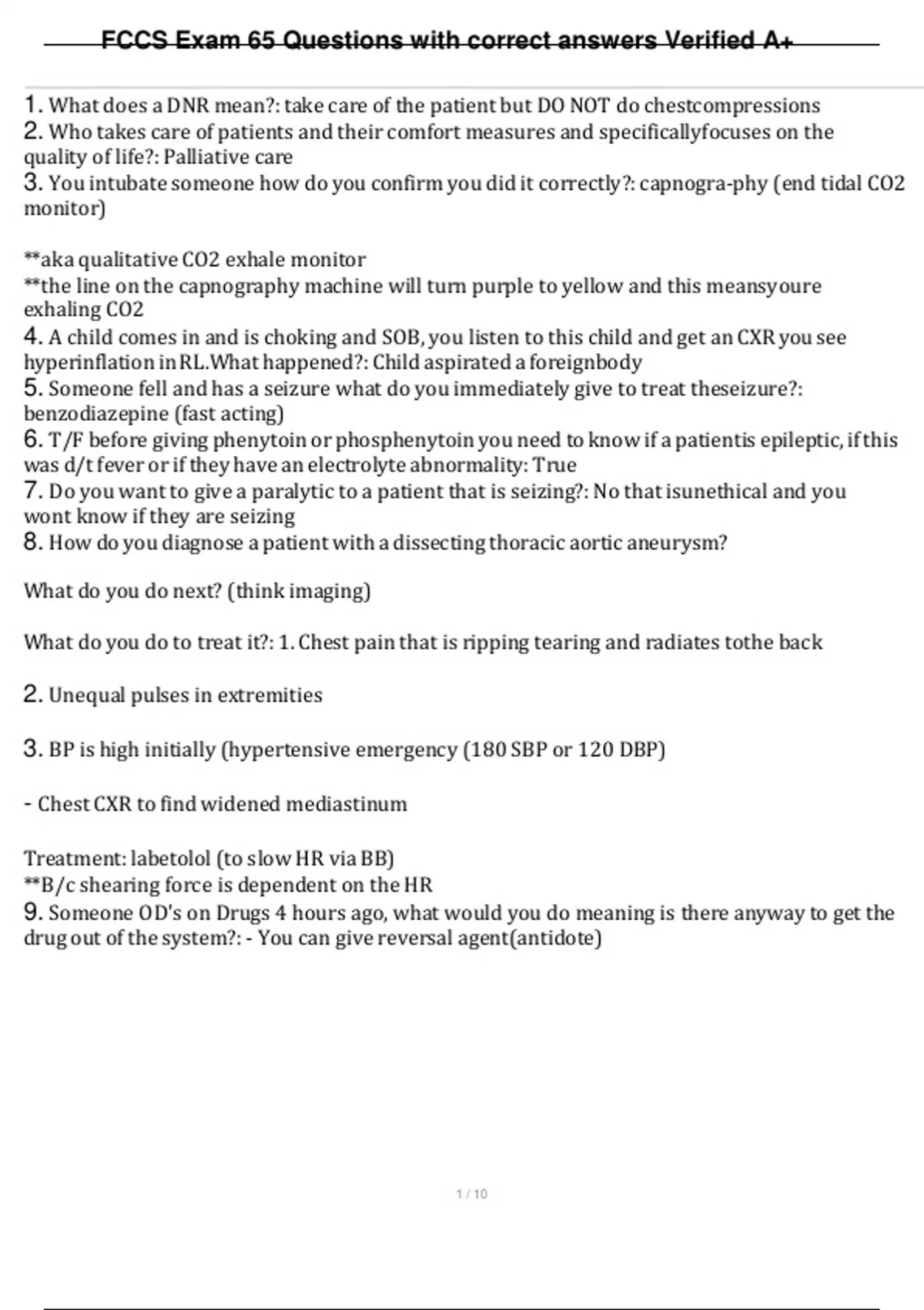 FCCS Exam 65 Questions with correct answers Verified A+ 1. What does a DNR mean?: take care of the patient but DO NOT do chest compressions 2. Who takes care of patients and their comfort measures and specifically focuses on the quality of life?: Palliative care 3. You intubate someone how do you confirm you did it correctly?: capnogra- phy (end tidal CO2 monitor) **aka qualitative CO2 exhale monitor **the line on the capnography machine will turn purple to yellow and this means youre exhaling CO2 4. A child comes in and is choking and SOB, you listen to this child and get an CXR you see hyperinflation in RL. What happened?: Child aspirated a foreign body 5. Someone fell and has a seizure what do you immediately give to treat the seizure?: benzodiazepine (fast acting) 6. T/F before giving phenytoin or phosphenytoin you need to know if a patient is epileptic, if this was d/t fever or if they have an electrolyte abnormality: True 7. Do you want to give a paralytic to a patient that is seizing?: No that is unethical and you wont know if they are seizing 8. How do you diagnose a patient with a dissecting thoracic aortic aneurysm? What do you do next? (think imaging) What do you do to treat it?: 1. Chest pain that is ripping tearing and radiates to the back 2. Unequal pulses in extremities 3. BP is high initially (hypertensive emergency (180 SBP or 120 DBP) - Chest CXR to find widened mediastinum Treatment: labetolol (to slow HR via BB) **B/c shearing force is dependent on the HR 9. Someone OD's on Drugs 4 hours ago, what would you do meaning is there anyway to get the drug out of the system?: - You can give reversal agent (antidote) - If it is > 2 hrs the drug is gone out of the GI nothing you can do for local control (NG or charcoal are local control) 10. You have a patient you suspect is having a PE. The patient has a history of COPD do you do a V/Q scan or a CTA?: CTA **b/c V/Q scan will automatically be abnormal wether or not there is a PE b/c lung disease causes and abnormal V/Q (ventilation perfusion) **if no lung disease then do V/Q 11. You have a patient w/DKA. a. You start them on insulin drip and fluid. When you give them insulin what is the goal? b. If BS is 200 and anion gap is still open what do you do? c. What BS number do you add dextrose? d. You keep giving D5 and insulin gtt until when?: a. To lower anion gap and lower BS by 50 mg/dl per hr b. add D5 to insulin c. <250 d. until anion gap closes 12. You have a DKA patient you start them on insulin drip and fluid.You started D5 when the patient hit a BS <250 mg/dL. The anion gap is now 8 what do you do and why?: add long acting insulin 1 hr prior to turning of insulin and D5 ggt. Do this so the patient does not rebound back into DKA. ***keep ggt running 1 hr after giving long actin insulin 13. A man comes in with septic shock. His CXR shows pneumonia. His BP is 70/35 mmHg. How much fluid do you give?: 30 ml/kg 14. A man comes in with septic shock. His CXR shows pneumonia. His BP is 70/35 mmHg. You gave him the standard 30 ml/kg and he is still hypotensive what do you give him? (step 1) He is still hypotensive what do you give? (step 2) He is still hypotensive what do you give (step 3): 1. norepinephrine then 2. vasopressin then 3. steriod (hydrocortisone) 15. How do you diagnose multiple myeloma? (think Hx and PE): OLD Calcium Inc**this is the big one **8-10 is norm levels Renal failure Anemia Back pain/lytic lesions **inc Ca causes lethargy and AMS and constipated 16. How do you treat hypercalcemia in Multiple Myeloma?: 1. IV fluid (lost like 3-4 L until you hear crackles in lung) 2. then give lasix **can also give bisphosphonates, calcitonin, steriods **make sure never to give lasix before fluid b/c you will kill the patient 17. You have an EKG and the patient has peaked T waves what d and what do you give?: Hyperkalemia give calcium gluconate/chloride 18. How do you treat someone w/neutropenic fever? What abx?: 1. Obtain culture 2. Give Broad spectrum abx (Vanco and pipercillan tazobactam) 3. When culture comes back narrow down abx to the specific bug **neutropenic fever 19. A patient comes in w/ Sepsis, fever low BP and has cellulitis in the peri- toneal area. How do you treat the patient?: 1 EARLY SURGICAL CONSULT 2.. Vancomycin 3. Clindamycin 4. Pipercillin/tazobactam