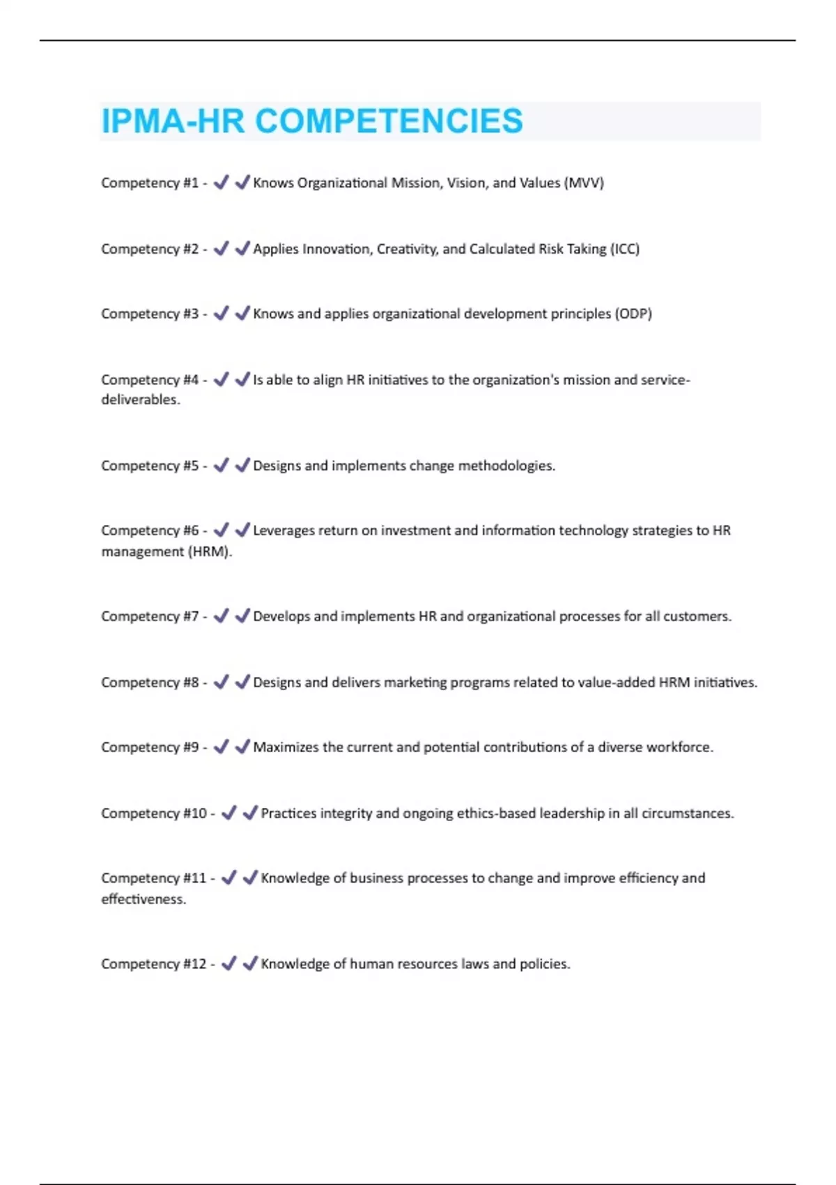 Competency #1 - Knows Organizational Mission, Vision, and Values (MVV) Competency #2 - Applies Innovation, Creativity, and Calculated Risk Taking (ICC) Competency #3 - Knows and applies organizational development principles (ODP) Competency #4 - Is able to align HR initiatives to the organization's mission and servicedeliverables. Competency #5 - Designs and implements change methodologies. Competency #6 - Leverages return on investment and information technology strategies to HR management (HRM). Competency #7 - Develops and implements HR and organizational processes for all customers. Competency #8 - Designs and delivers marketing programs related to value-added HRM initiatives. Competency #9 - Maximizes the current and potential contributions of a diverse workforce. Competency #10 - Practices integrity and ongoing ethics-based leadership in all circumstances. Competency #11 - Knowledge of business processes to change and improve efficiency and effectiveness. Competency #12 - Knowledge of human resources laws and policies.Competency #13 - Awareness of the unique nature of the public service environment. Competency #14 - Understand team behavior and possess the ability to lead teams to high performance. Competency #15 - Communicate effectively verbally and in writing and make persuasive presentations on behalf of the HRs function. Competency #16 - Assess and balance competing values found within the organization (e.g., the greater mission and vision, various department values, values as demonstrated by executive and midmanagement leadership.) Competency #17 - Use business systems skills, including the ability to think strategically and creatively. Competency #18 - Analyze organizational issues to develop collaborative solutions that meet the needs of all stakeholders. Competency #19 - Use negotiating skills, including consesus-builiding, coalition-building, and dispute resolution Competency #20 - Build and sustain trust-based relationships.