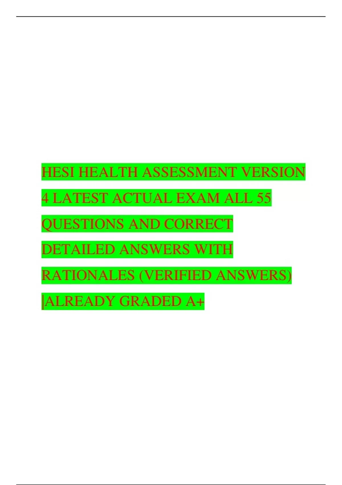 HESI HEALTH ASSESSMENT VERSION 4 LATEST ACTUAL EXAM ALL 55 QUESTIONS AND CORRECT DETAILED ANSWERS WITH RATIONALES (VERIFIED ANSWERS) |ALREADY GRADED A+