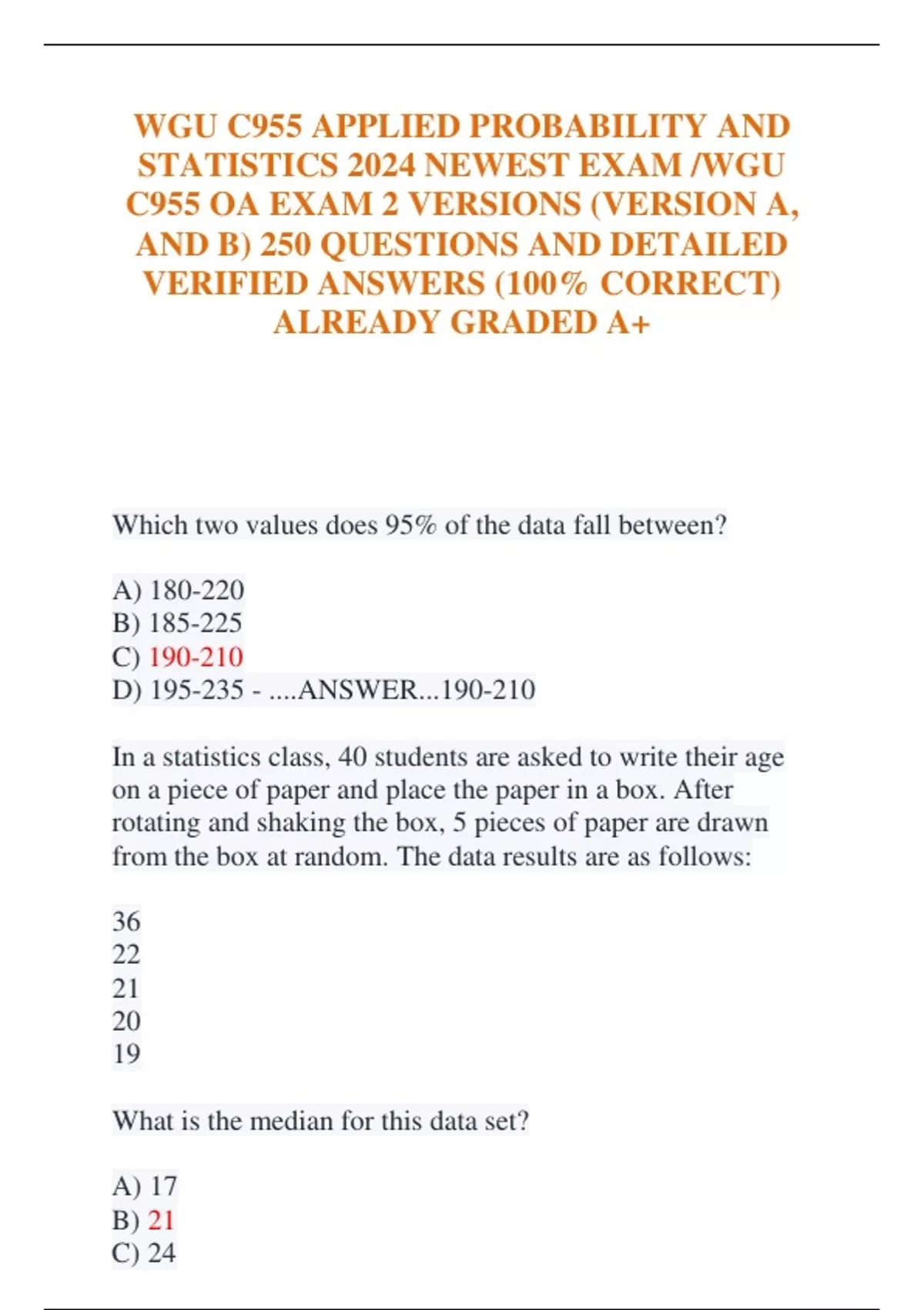 WGU C955 APPLIED PROBABILITY AND STATISTICS 2024 NEWEST EXAM /WGU C955 OA EXAM 2 VERSIONS (VERSION A, AND B) 250 QUESTIONS AND DETAILED VERIFIED ANSWERS (100% CORRECT) ALREADY GRADED A+