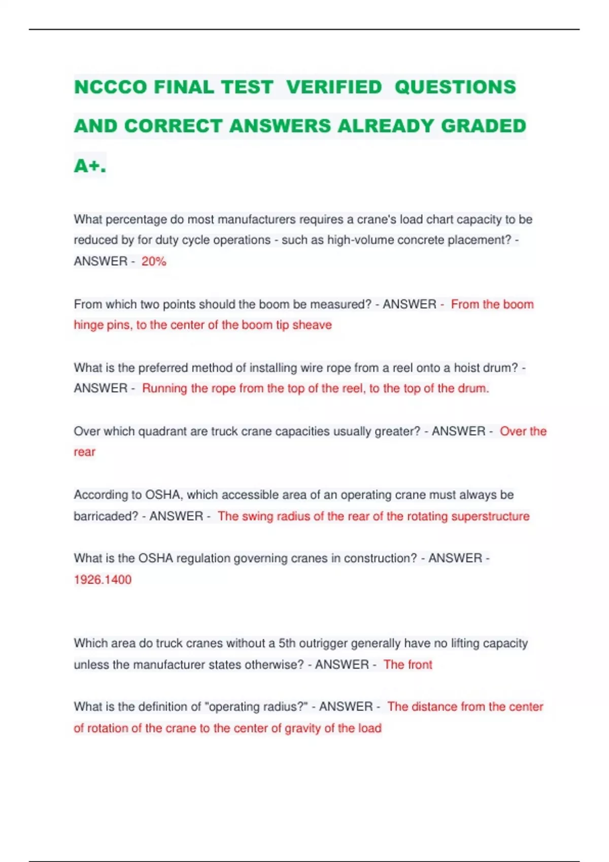 NCCCO FINAL TEST VERIFIED QUESTIONS AND CORRECT ANSWERS ALREADY GRADED A+. What percentage do most manufacturers requires a crane's load chart capacity to be reduced by for duty cycle operations - such as high-volume concrete placement? - ANSWER - 20% From which two points should the boom be measured? - ANSWER - From the boom hinge pins, to the center of the boom tip sheave What is the preferred method of installing wire rope from a reel onto a hoist drum? - ANSWER - Running the rope from the top of the reel, to the top of the drum. Over which quadrant are truck crane capacities usually greater? - ANSWER - Over the rear