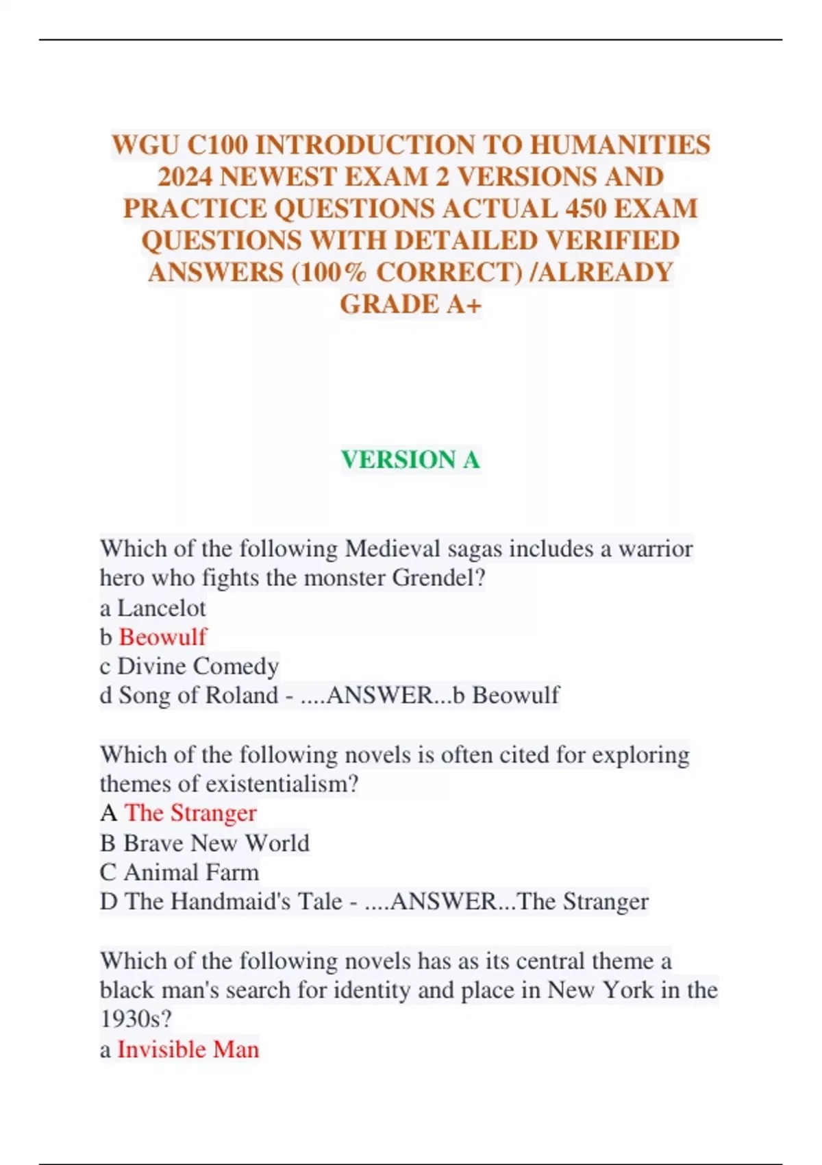 WGU C100 INTRODUCTION TO HUMANITIES 2024 NEWEST EXAM 2 VERSIONS AND PRACTICE QUESTIONS ACTUAL 450 EXAM QUESTIONS WITH DETAILED VERIFIED ANSWERS (100% CORRECT) /ALREADY GRADE A+