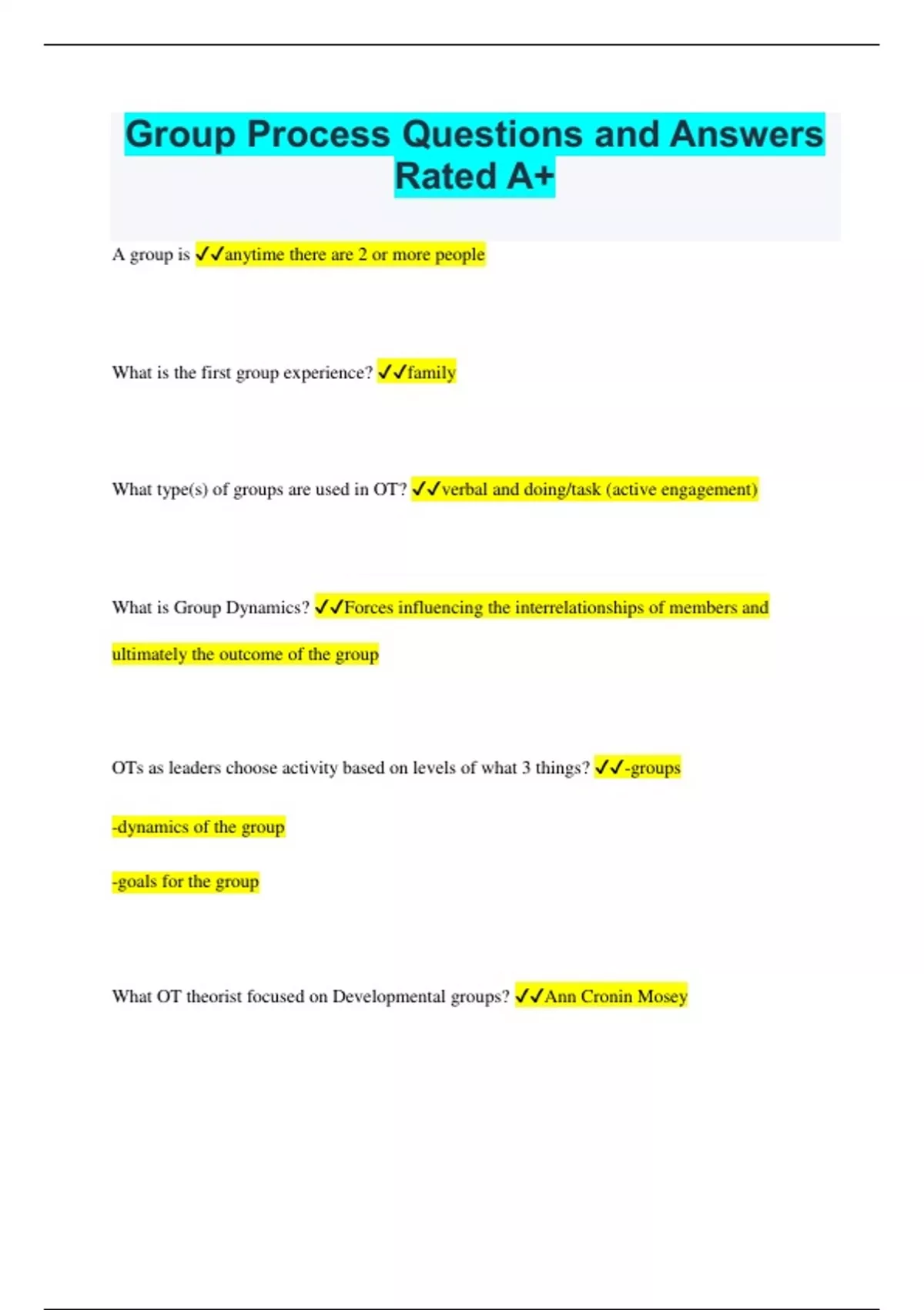 Group Process Questions and Answers Rated A+ A group is anytime there are 2 or more people What is the first group experience? family What type(s) of groups are used in OT? verbal and doing/task (active engagement) What is Group Dynamics? Forces influencing the interrelationships of members and ultimately the outcome of the group OTs as leaders choose activity based on levels of what 3 things? -groups -dynamics of the group -goals for the group What OT theorist focused on Developmental groups? Ann Cronin Mosey What is a developmental group? clinical simulations of the various types of non-familial groups usually encountered in the normal development process What are the 5 types of developmental groups? 1. parallel 2. project 3. egocentric-cooperative 4. cooperative 5. mature What type of group is made up of patients who are involved in individual tasks with minimal necessity for interaction? Parallel Group What is the therapists role in a parallel group? to provide assistance with tasks and takes responsibility for meeting the social-emotional needs of group members What type of group is made up of members who are involved in common short-term tasks that require some interaction, cooperation, and competition? Project Group What is the therapists role in a project group? Provides or assists in task selection and responds to the social-emotional needs of group members What type of group is characterized by group members selecting, implementing, and executing relatively long-term tasks through joint interaction? Egocentric-cooperative Group This group needs client interaction and emphasis on reciprocal interaction and responding to others needs? Egocentric-cooperative Group What is the role of the therapist in a egocentric-cooperative group? provides support and guidance with the task, satisfies much of the member's emotional needs In this group members are encouraged to identify and gratify others social-emotional needs in conjunction to task accomplishments.....may be same sex groups? Cooperative Group What is the role of the therapist in a cooperative