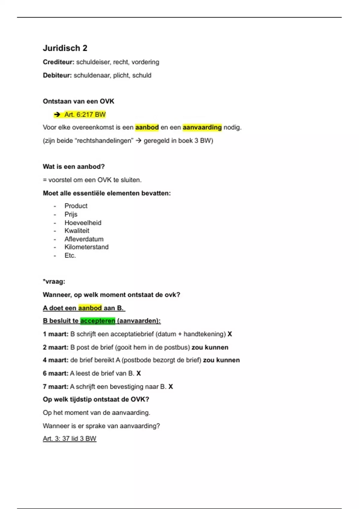 - Art. 6:217 BW  voor elke OVK is nodig: aanbod en aanvaarding.