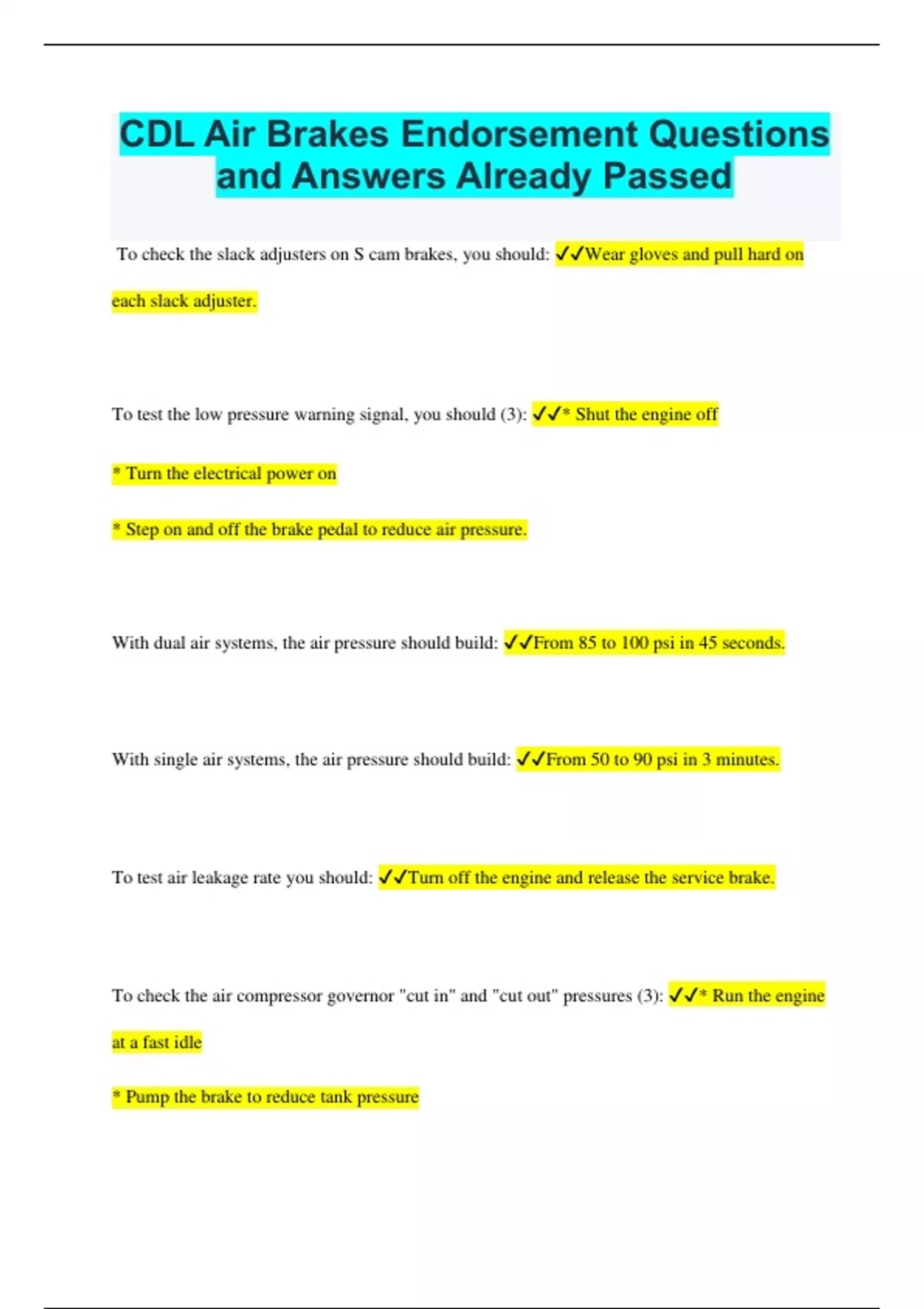 CDL Air Brakes Endorsement Questions and Answers Already Passed To check the slack adjusters on S cam brakes, you should: Wear gloves and pull hard on each slack adjuster. To test the low pressure warning signal, you should (3): * Shut the engine off * Turn the electrical power on * Step on and off the brake pedal to reduce air pressure. With dual air systems, the air pressure should build: From 85 to 100 psi in 45 seconds. With single air systems, the air pressure should build: From 50 to 90 psi in 3 minutes. To test air leakage rate you should: Turn off the engine and release the service brake. To check the air compressor governor "cut in" and "cut out" pressures (3): * Run the engine at a fast idle * Pump the brake to reduce tank pressure * Monitor the air pressure gauge The governor allows the air to start pumping again when it reaches the cut in level or around: 100 psi The governor stops pumping air when it reaches the "cut out" level, or around: 125 psi You should use the parking brake: Any time you park. To test your service brakes you should: Release the parking brake, move forward slowly and press the brake pedal. A combination vehicle air brake system should not lose air faster than: 3 psi per minute The safety valve in the air compressor tank is set to open at: 150 psi When the safety valve releases air it means that (3): * The pressure has exceeded 150 psi * Too much air is in the air compressor * Something is wrong and you should have it checked by a mechanic When the low pressure warning is activated, you should: Bring the vehicle to a safe stop while you still have braking control. Stab braking occurs when you (3): * Press on the brake pedal as hard as you can * Release the brakes when the wheels lock up * Apply the brakes when the wheels start rolling A fully charged air system typically has how many psi? 125 psi Compressed air is stored: In the storage tank(s) The Air Compressor Governor controls: When the air compressor pumps air into the storage tanks. Which type of brake is the most common in commercial