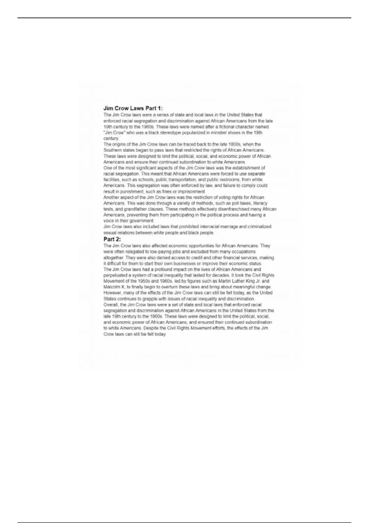 This is a detailed and comprehensive note tht covers Basic Information on the negative effects of the Jim Crow Laws back then. U'll need it!?