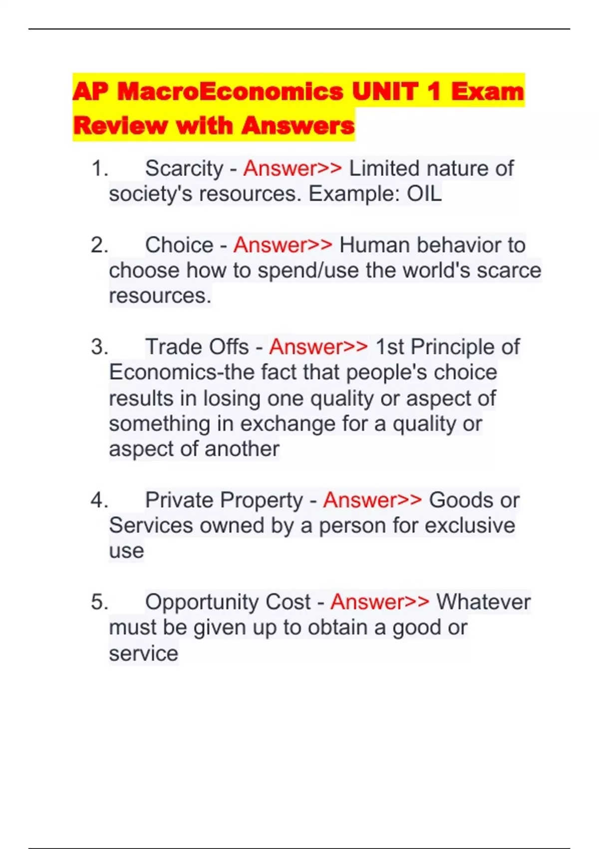 AP MacroEconomics UNIT 1 Exam Review with Answers 1. Scarcity - Answer>> Limited nature of society's resources. Example: OIL 2. Choice - Answer>> Human behavior to choose how to spend/use the world's scarce resources. 3. Trade Offs - Answer>> 1st Principle of Economics-the fact that people's choice results in losing one quality or aspect of something in exchange for a quality or aspect of another