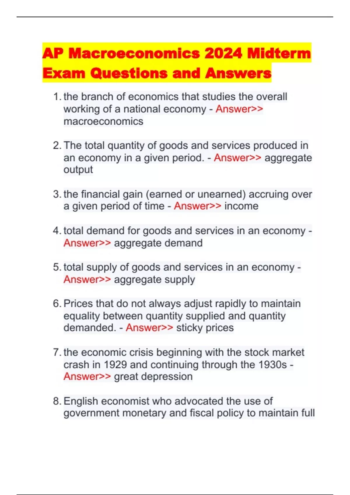 AP Macroeconomics 2024 Midterm Exam Questions and Answers 1. the branch of economics that studies the overall working of a national economy - Answer>> macroeconomics 2. The total quantity of goods and services produced in an economy in a given period. - Answer>> aggregate output 3. the financial gain (earned or unearned) accruing over a given period of time - Answer>> income 4. total demand for goods and services in an economy - Answer>> aggregate demand 5. total supply of goods and services in an economy - Answer>> aggregate supply