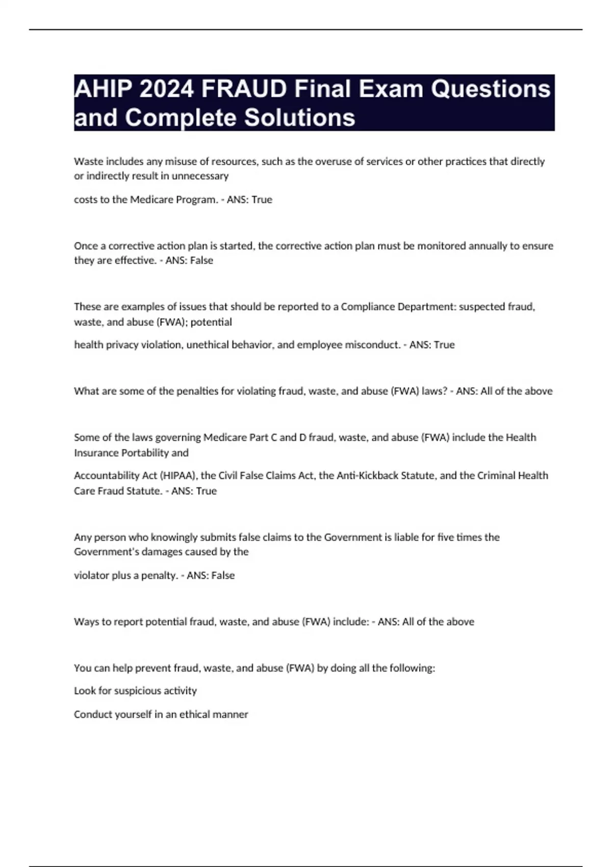 AHIP 2024 FRAUD Final Exam Questions and Complete Solutions