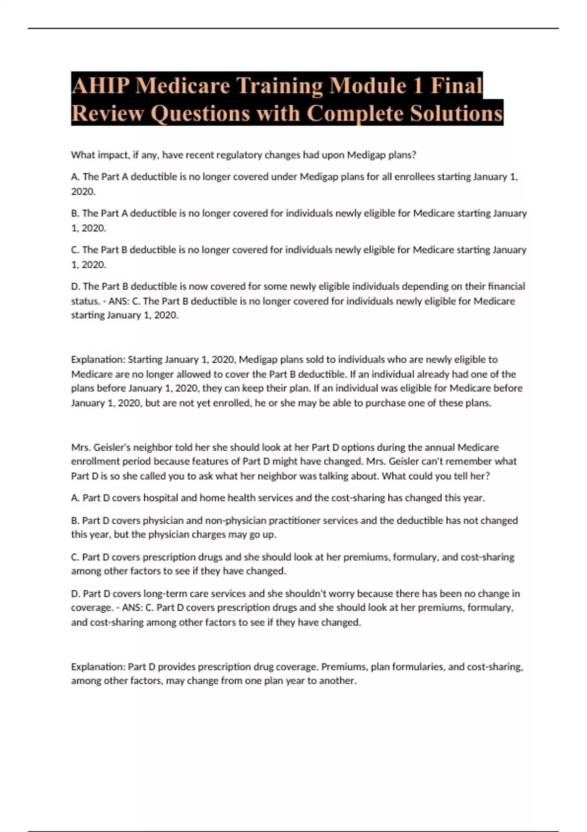AHIP Medicare Training Module 1 Final Review Questions with Complete Solutions
