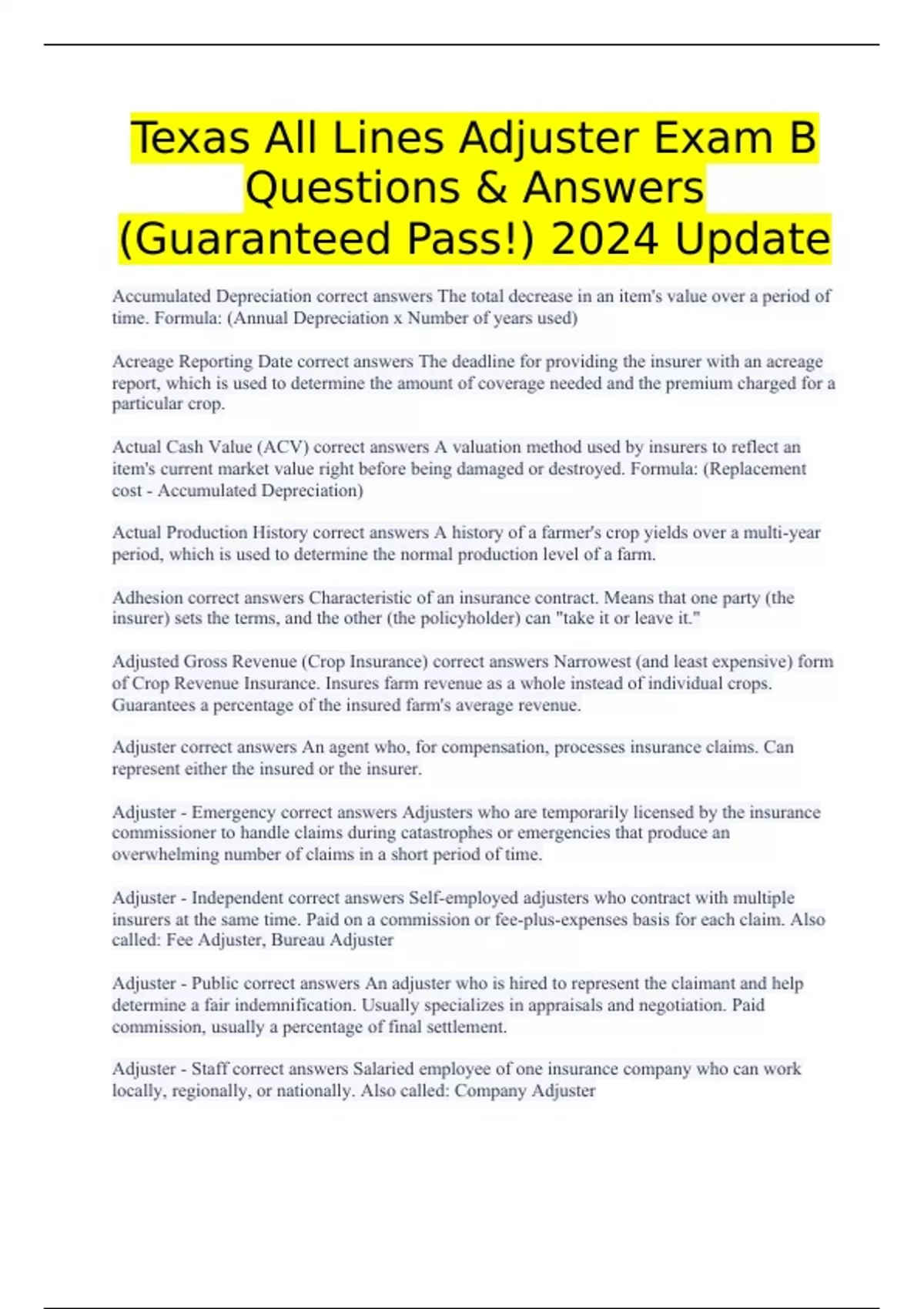Texas All Lines Adjuster Exam B Questions & Answers (Guaranteed Pass!) 2024 Update