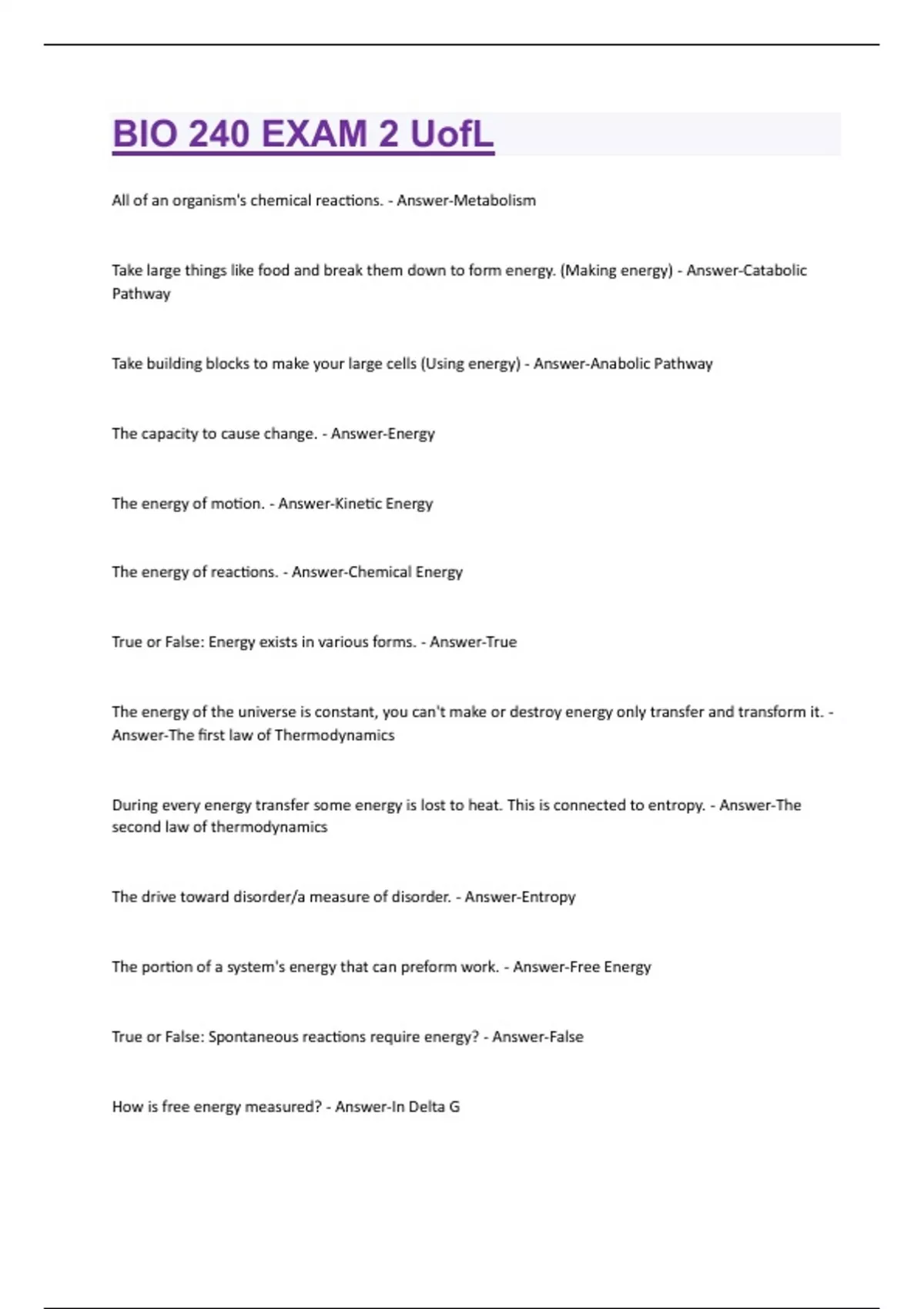 All of an organism's chemical reactions. - Answer-Metabolism Take large things like food and break them down to form energy. (Making energy) - Answer-Catabolic Pathway Take building blocks to make your large cells (Using energy) - Answer-Anabolic Pathway The capacity to cause change. - Answer-Energy The energy of motion. - Answer-Kinetic Energy The energy of reactions. - Answer-Chemical Energy True or False: Energy exists in various forms. - Answer-True The energy of the universe is constant, you can't make or destroy energy only transfer and transform it. - Answer-The first law of Thermodynamics During every energy transfer some energy is lost to heat. This is connected to entropy. - Answer-The second law of thermodynamics The drive toward disorder/a measure of disorder. - Answer-Entropy The portion of a system's energy that can preform work. - Answer-Free Energy True or False: Spontaneous reactions require energy? - Answer-False How is free energy measured? - Answer-In Delta GIf something has a negative delta g the reaction is ____________. - Answer-Spontaneous How is delta g calculated? - Answer-Energy of Products - Energy of Reactants A spontaneous reaction can also be called a __________ reaction. - Answer-Exergonic When the energy of the product is higher than the energy of the reactants it is known as a __________ reaction. - Answer-Endergonic What are the three kinds of work that are preformed? - Answer-Transport, Mechanical, and Chemical What is transport work? - Answer-Moving things in and out of the cell. What is mechanical work? - Answer-Moving things around the cell. What is chemical work? - Answer-Metabolism (or chemical reactions). What do cells use to be able to complete work? - Answer-Energy Coupling The use of an exergonic process to drive and endergonic one is called? - Answer-Energy Coupling What is ATP composed of? - Answer-Ribose, Adenine, and Three Phosphate Groups. Where is the energy located in ATP? - Answer-The last phosphate bond. When you increase the level of energy of reactants before you decrease to the energy of your products this is called..... - Answer-Activation EnergyActivation energy is decreased, and the reaction goes faster when you add what? - Answer-An Enzyme What binds to an enzyme? - Answer-Substrate What is enzyme specificity? - Answer-An enzyme only accepts specific substrates. When a molecule fits into enzymes active site and blocks the substrate from binding to an enzyme. - Answer-Competitive Inhibition When there is binding to the allosteric site on an enzyme and it changes the shape of the activation site. - Answer-Non-Competitive Inhibition What keeps cells from using more energy on something it already has a surplus of? - Answer-Feedback Inhibition Any organism capable of self-nourishment by using inorganic materials as a source of nutrients and using photosynthesis or chemosynthesis as a source of energy, as most plants and certain bacteria and protists. - Answer-Autotroph An organism requiring organic compounds for its principal source of food. - Answer-Heterotroph Chemical reactions that transfer electrons between reactants. - Answer-Redox Reaction Loses electrons and hydrogen. - Answer-Oxidation Gains electrons and hydrogen. - Answer-Reduction