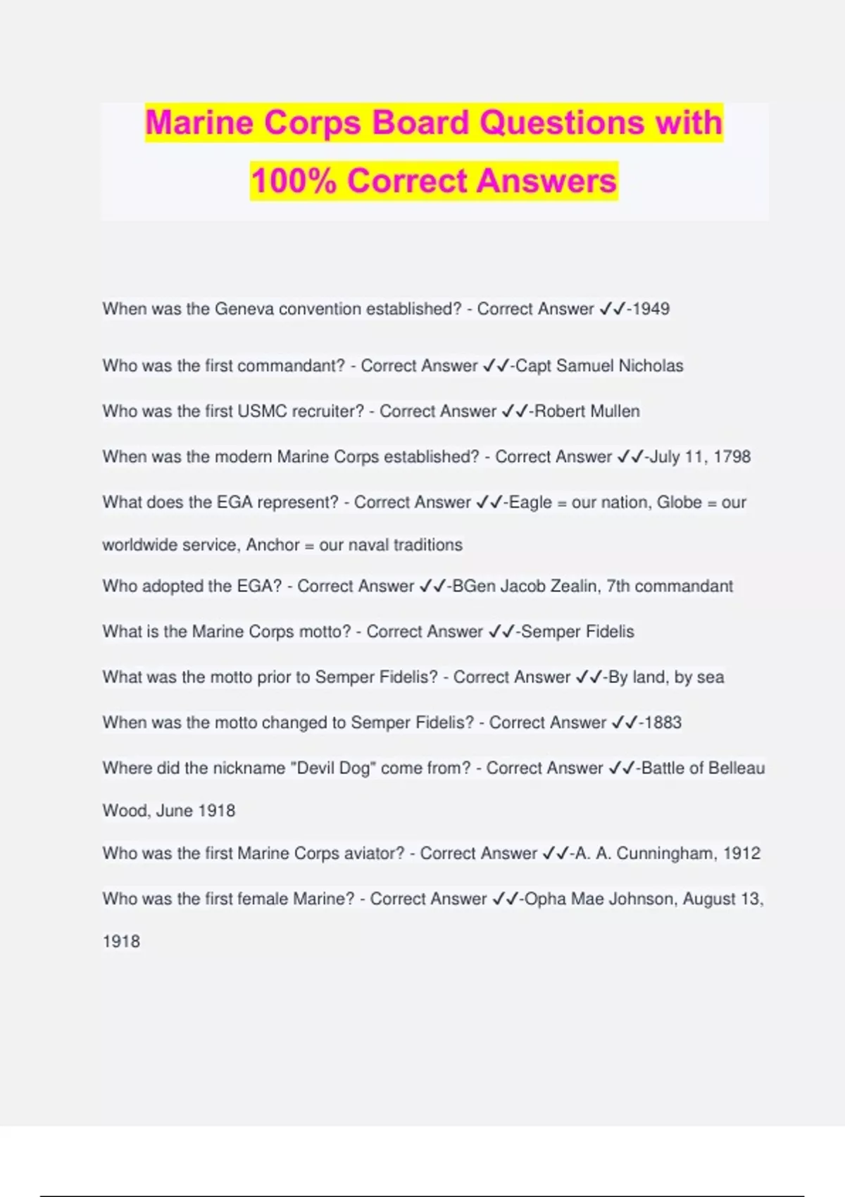 Marine Corps Board Questions with 100% Correct Answers When was the Geneva convention established? - Correct Answer ️️ -1949 Who was the first commandant? - Correct Answer ️️ -Capt Samuel Nicholas Who was the first USMC recruiter? - Correct Answer ️️ -Robert Mullen When was the modern Marine Corps established? - Correct Answer ️️ -July 11, 1798 What does the EGA represent? - Correct Answer ️️ -Eagle = our nation, Globe = our worldwide service, Anchor = our naval traditions Who adopted the EGA? - Correct Answer ️️ -BGen Jacob Zealin, 7th commandant What is the Marine Corps motto? - Correct Answer ️️ -Semper Fidelis What was the motto prior to Semper Fidelis? - Correct Answer ️️ -By land, by sea When was the motto changed to Semper Fidelis? - Correct Answer ️️ -1883 Where did the nickname "Devil Dog" come from? - Correct Answer ️️ -Battle of Belleau Wood, June 1918 Who was the first Marine Corps aviator? - Correct Answer ️️ -A. A. Cunningham, 1912 Who was the first female Marine? - Correct Answer ️️ -Opha Mae Johnson, August 13, 1918