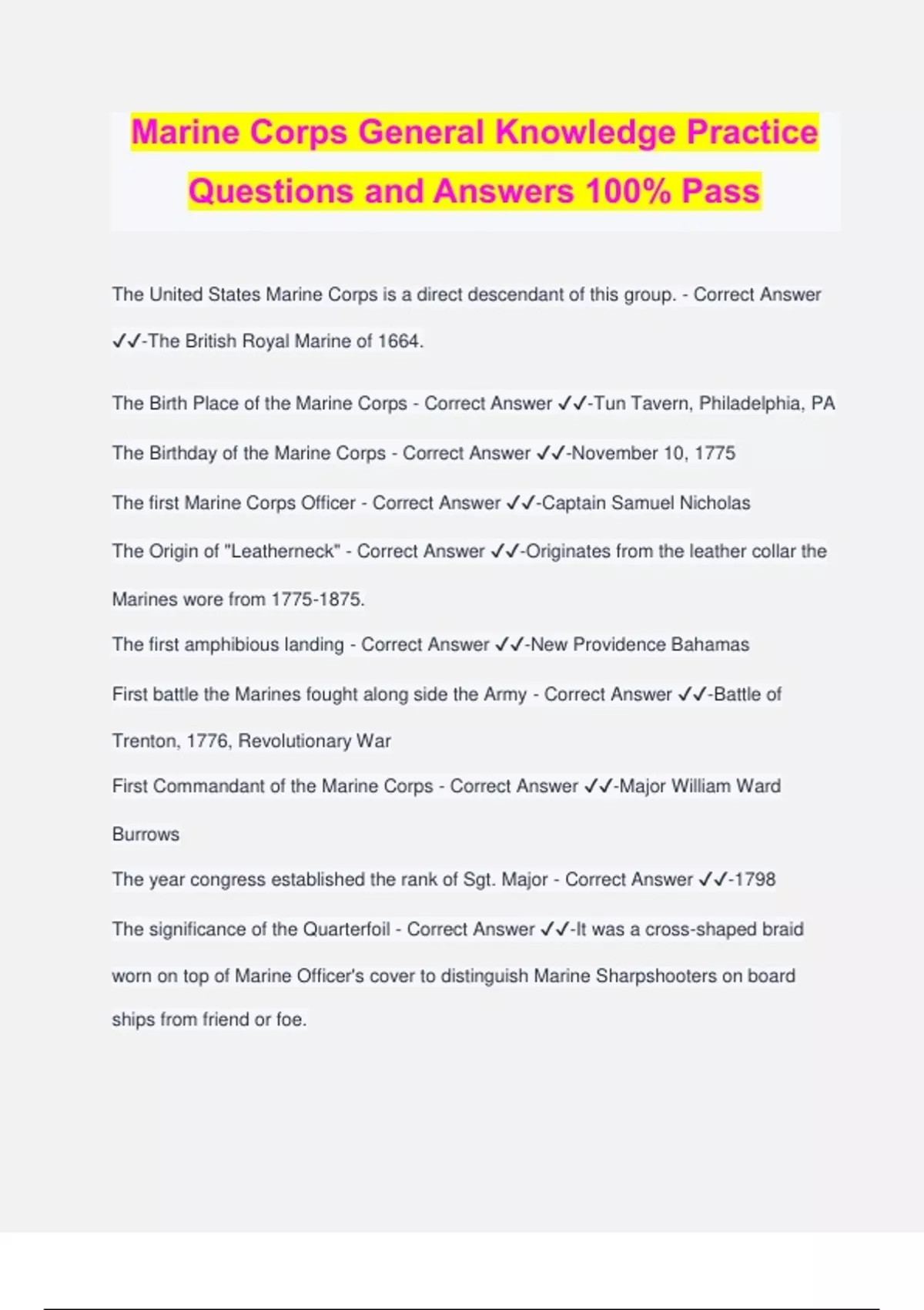 Marine Corps General Knowledge Practice Questions and Answers 100% Pass The United States Marine Corps is a direct descendant of this group. - Correct Answer ️️ -The British Royal Marine of 1664. The Birth Place of the Marine Corps - Correct Answer ️️ -Tun Tavern, Philadelphia, PA The Birthday of the Marine Corps - Correct Answer ️️ -November 10, 1775 The first Marine Corps Officer - Correct Answer ️️ -Captain Samuel Nicholas The Origin of "Leatherneck" - Correct Answer ️️ -Originates from the leather collar the Marines wore from . The first amphibious landing - Correct Answer ️️ -New Providence Bahamas First battle the Marines fought along side the Army - Correct Answer ️️ -Battle of Trenton, 1776, Revolutionary War First Commandant of the Marine Corps - Correct Answer ️️ -Major William Ward Burrows The year congress established the rank of Sgt. Major - Correct Answer ️️ -1798 The significance of the Quarterfoil - Correct Answer ️️ -It was a cross-shaped braid worn on top of Marine Officer's cover to distinguish Marine Sharpshooters on board ships from friend or foe.