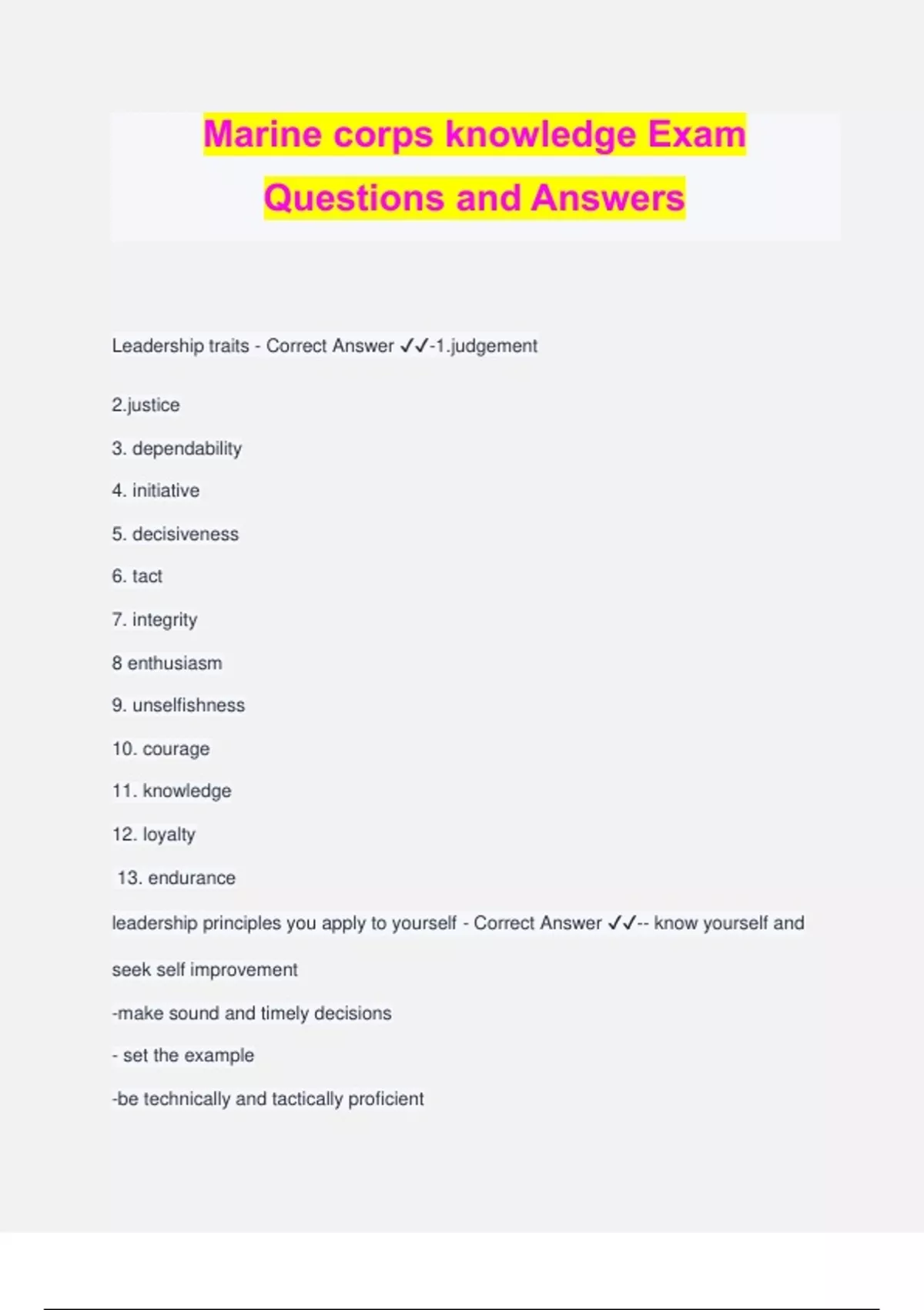 Marine corps knowledge Exam Questions and Answers Leadership traits - Correct Answer ️️ -ment ce 3. dependability 4. initiative 5. decisiveness 6. tact 7. integrity 8 enthusiasm 9. unselfishness 10. courage 11. knowledge 12. loyalty 13. endurance leadership principles you apply to yourself - Correct Answer ️️ -- know yourself and seek self improvement -make sound and timely decisions - set the example -be technically and tactically proficient -seek responsibility and take responsibility for your actions leader principles you apply to others - Correct Answer ️️ -- know your subordinates -keep your subordinates informed -train your subordinates as a team -develop a sense of responsibility among your subordinates core values - Correct Answer ️️ -- honor -courage -commitment USMC uniform types - Correct Answer ️️ --dress -service -utility -physical training what does the lamp of learning signify? - Correct Answer ️️ -The device used in the cadet enlisted rank insignia signifies intensive study, a source of intellect, and a moral and spiritual illumination. Components of the marine emblem - Correct Answer ️️ --Eagle -Globe -Anchor Birthday and birthplace of the marine corps - Correct Answer ️️ -10 November 1775 tun's tavern Philadelphia pensylvania