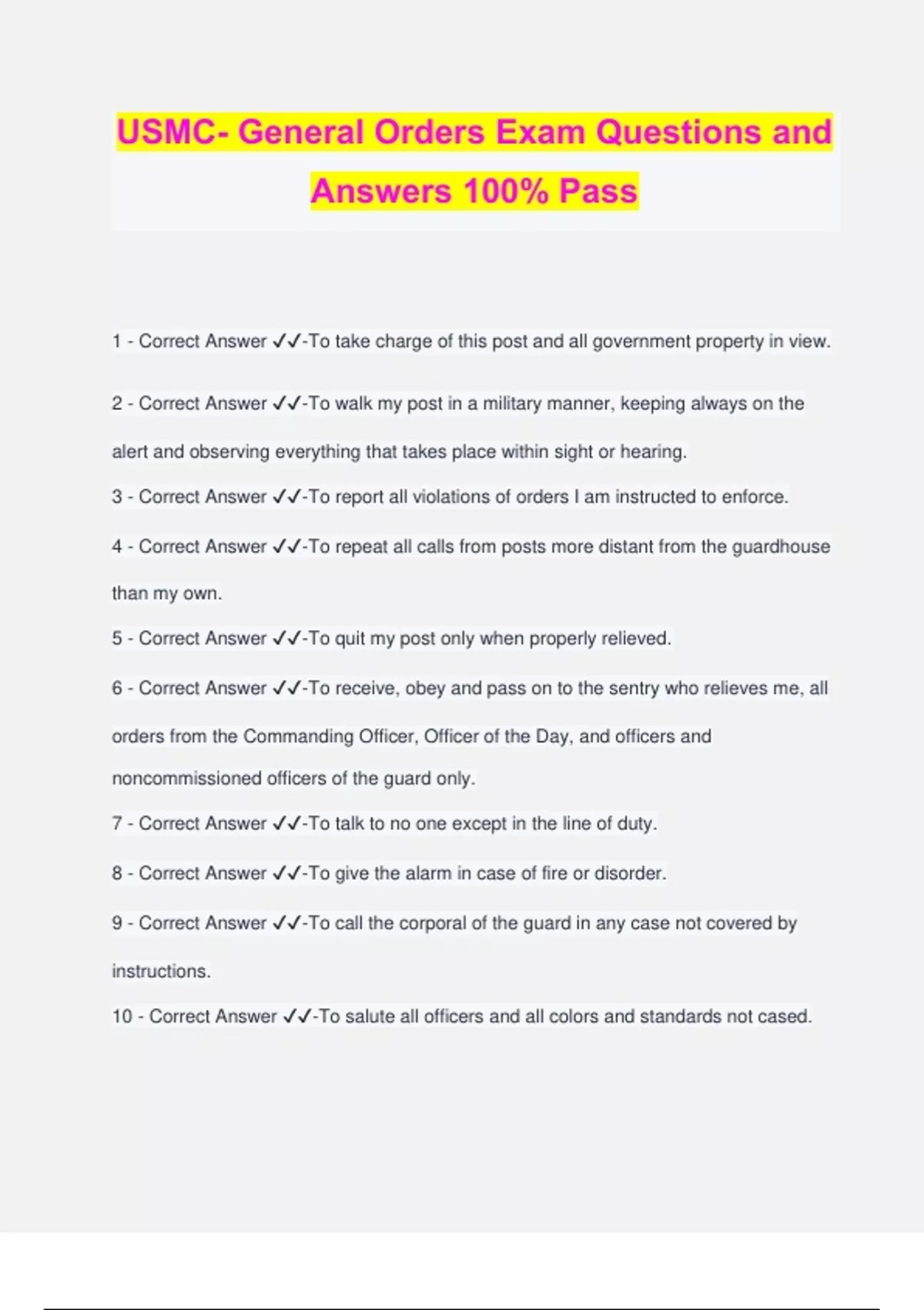 USMC- General Orders Exam Questions and Answers 100% Pass 1 - Correct Answer ️️ -To take charge of this post and all government property in view. 2 - Correct Answer ️️ -To walk my post in a military manner, keeping always on the alert and observing everything that takes place within sight or hearing. 3 - Correct Answer ️️ -To report all violations of orders I am instructed to enforce. 4 - Correct Answer ️️ -To repeat all calls from posts more distant from the guardhouse than my own. 5 - Correct Answer ️️ -To quit my post only when properly relieved.