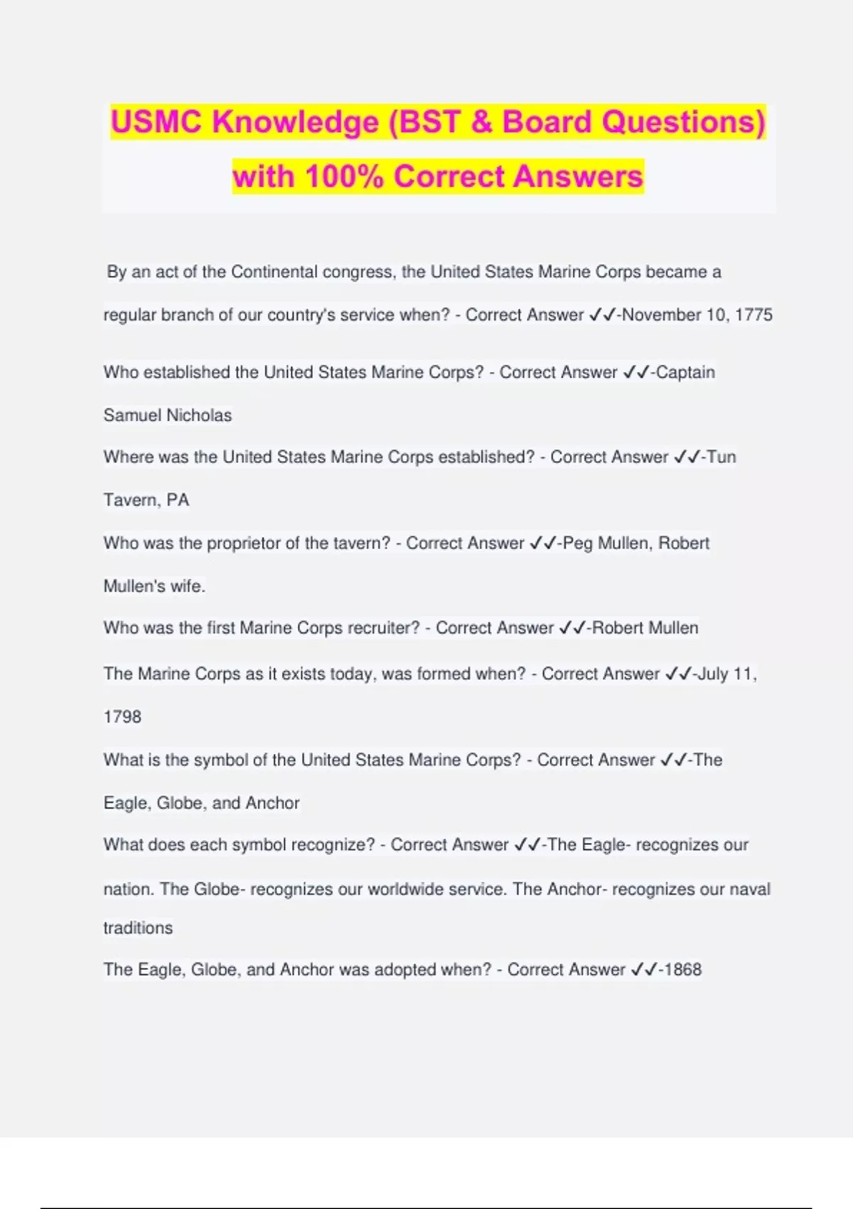 USMC Knowledge (BST & Board Questions) with 100% Correct Answers By an act of the Continental congress, the United States Marine Corps became a regular branch of our country's service when? - Correct Answer ️️ -November 10, 1775 Who established the United States Marine Corps? - Correct Answer ️️ -Captain Samuel Nicholas Where was the United States Marine Corps established? - Correct Answer ️️ -Tun Tavern, PA Who was the proprietor of the tavern? - Correct Answer ️️ -Peg Mullen, Robert Mullen's wife. Who was the first Marine Corps recruiter? - Correct Answer ️️ -Robert Mullen The Marine Corps as it exists today, was formed when? - Correct Answer ️️ -July 11, 1798 What is the symbol of the United States Marine Corps? - Correct Answer ️️ -The Eagle, Globe, and Anchor What does each symbol recognize? - Correct Answer ️️ -The Eagle- recognizes our nation. The Globe- recognizes our worldwide service. The Anchor- recognizes our naval traditions The Eagle, Globe, and Anchor was adopted when? - Correct Answer ️️ -1868 Who adopted the Eagle, Globe, and Anchor? - Correct Answer ️️ -Brig. General Jacob Zealin, 7th Commandant, USMC The term Leatherneck comes from where? - Correct Answer ️️ -From when the Marines wore a leather strap to protect their neck from enemy swords, from . What is the Marine Corps motto? - Correct Answer ️️ -"Semper Fidelis" What was the Marine Corps motto before "Semper Fidelis"? - Correct Answer ️️ -"By land, by sea" When was the Marine Corps motto changed to "Semper Fidelis"? - Correct Answer ️️ - 1880 Where do Marines get the nickname "Devil Dog"? - Correct Answer ️️ -From the battle of Belleau Wood in June 1918 Who was the first Marine Corps aviator? - Correct Answer ️️ -A. A. Cunningham, in 1912 Who was the first woman Marine? - Correct Answer ️️ -Opha M. Johnson, on August 13, 1918 Who was the first Marine helo pilot to receive the Medal of Honor? - Correct Answer ️️ -Major Stephen Pless Who was the first Marine pilot to shoot down an enemy plane? - Correct Answer ️️ -1st Lt. E. S. Brewer Who was the first female Marine Warrant Officer? - Correct Answer ️️ -CWO Ruth L. Wood Who was the first Marine Officer to die in battle? - Correct Answer ️️ -Captain John Fitzpatrick Which Marine served the longest term as Commandant? - Correct Answer ️️ - Archibald Henderson How long did Archibald Henderson serve as Commandant? - Correct Answer ️️ -38 years How much time does a person have to dawn and clear the gas mask? - Correct Answer ️️ -15 seconds Which Commandant installed the office of Sergeant Major of the Marine Corps? - Correct Answer ️️ -The 21st Commandant, General Pate; in 1957 On Feb. 20, 1962, one of the Marine Corps' finest pilots manned the first capsule to orbit the earth. Who was it? - Correct Answer ️️ -Lieutenant Colonel John H. Glenn When was the dress blue uniform adopted? - Correct Answer ️️ -On August 24, 1797 Who adopted the dress blue uniform? - Correct Answer ️️ -Sec. of War James McHenry The Mameluke sword was presented to whom? - Correct Answer ️️ -Lt. Presley N. O'Bannon
