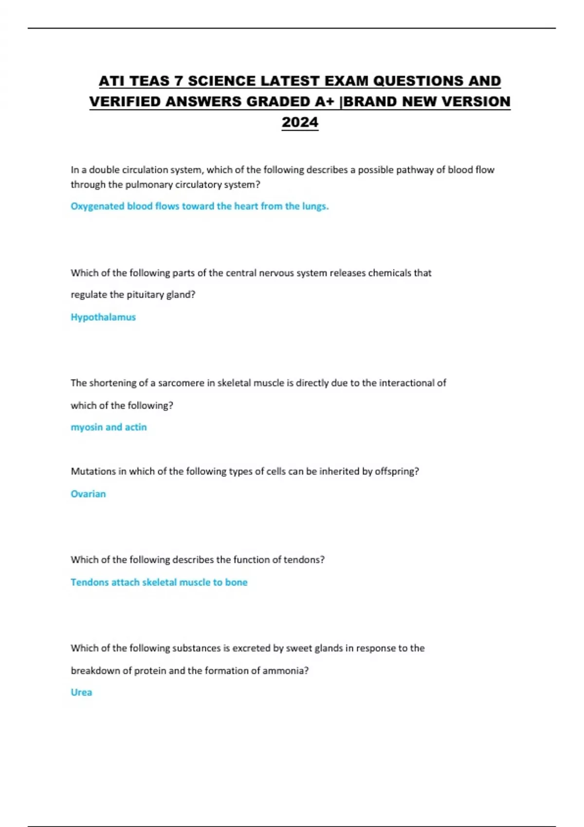ATI TEAS 7 SCIENCE LATEST EXAM QUESTIONS AND VERIFIED ANSWERS GRADED A+ |BRAND NEW VERSION 2024