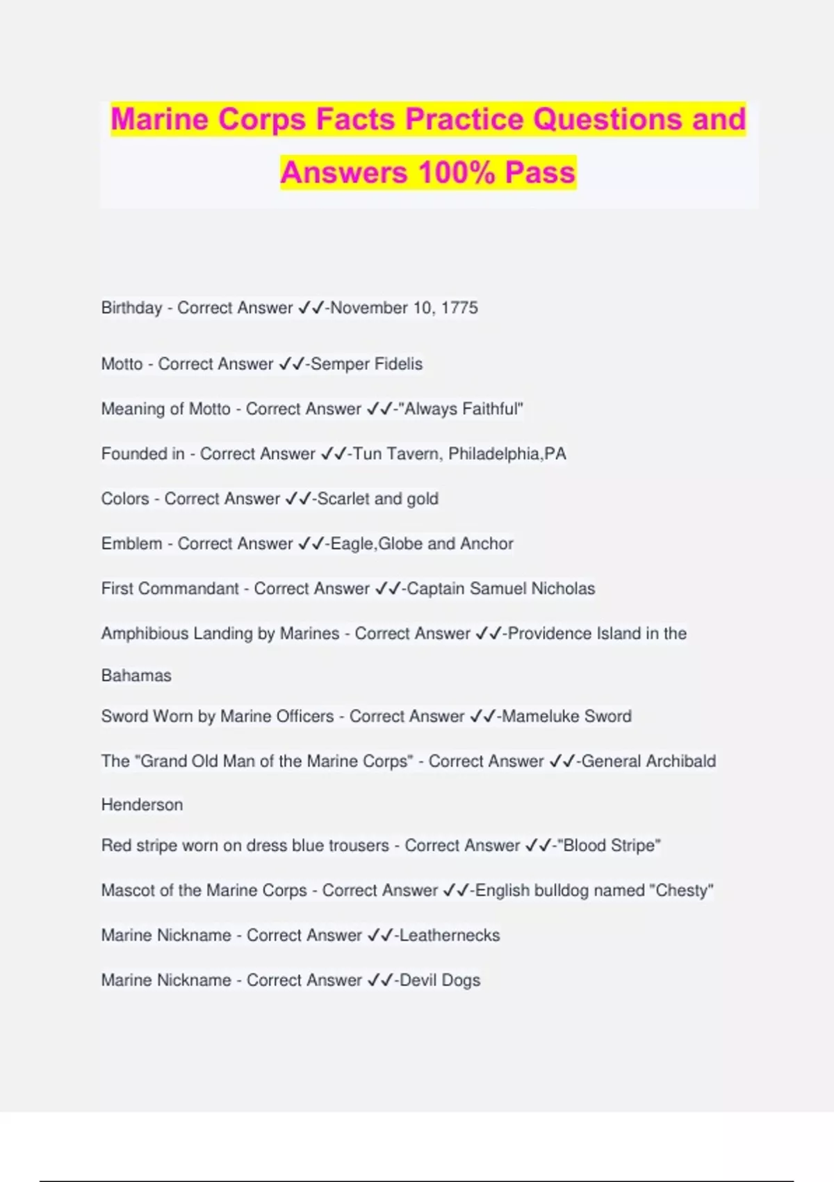 Marine Corps Facts Practice Questions and Answers 100% Pass Birthday - Correct Answer ️️ -November 10, 1775 Motto - Correct Answer ️️ -Semper Fidelis Meaning of Motto - Correct Answer ️️ -"Always Faithful" Founded in - Correct Answer ️️ -Tun Tavern, Philadelphia,PA Colors - Correct Answer ️️ -Scarlet and gold Emblem - Correct Answer ️️ -Eagle,Globe and Anchor First Commandant - Correct Answer ️️ -Captain Samuel Nicholas Amphibious Landing by Marines - Correct Answer ️️ -Providence Island in the Bahamas