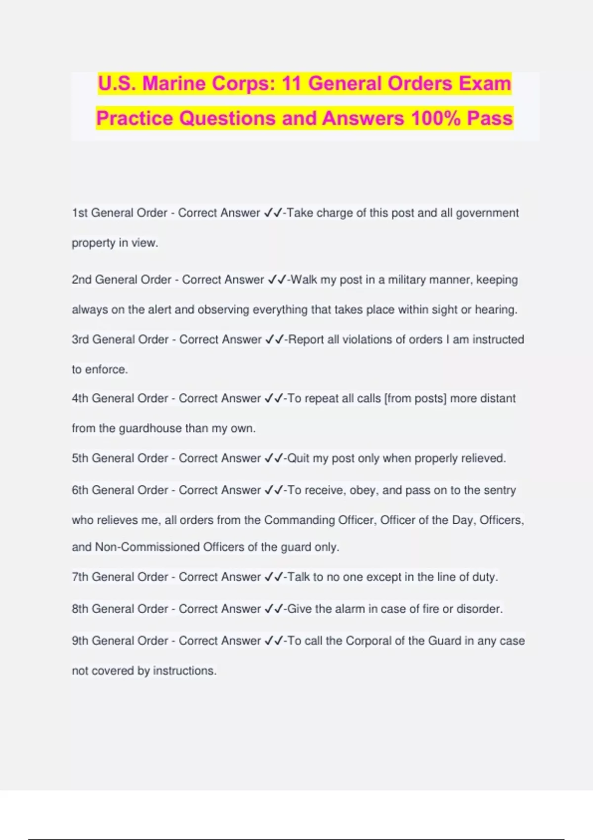 U.S. Marine Corps: 11 General Orders Exam Practice Questions and Answers 100% Pass