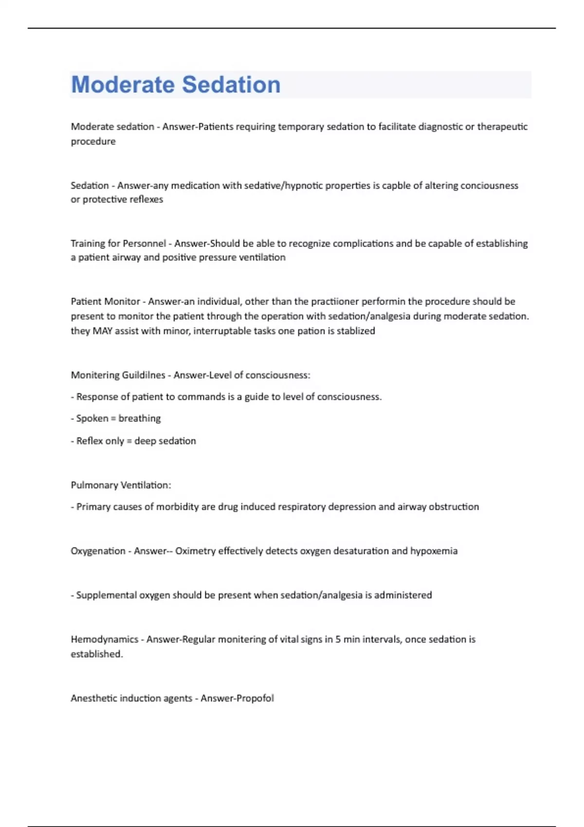 Moderate sedation - Answer-Patients requiring temporary sedation to facilitate diagnostic or therapeutic procedure Sedation - Answer-any medication with sedative/hypnotic properties is capble of altering conciousness or protective reflexes Training for Personnel - Answer-Should be able to recognize complications and be capable of establishing a patient airway and positive pressure ventilation Patient Monitor - Answer-an individual, other than the practiioner performin the procedure should be present to monitor the patient through the operation with sedation/analgesia during moderate sedation. they MAY assist with minor, interruptable tasks one pation is stablized Monitering Guildilnes - Answer-Level of consciousness: - Response of patient to commands is a guide to level of consciousness. - Spoken = breathing - Reflex only = deep sedation Pulmonary Ventilation: - Primary causes of morbidity are drug induced respiratory depression and airway obstruction Oxygenation - Answer-- Oximetry effectively detects oxygen desaturation and hypoxemia - Supplemental oxygen should be present when sedation/analgesia is administered Hemodynamics - Answer-Regular monitering of vital signs in 5 min intervals, once sedation is established. Anesthetic induction agents - Answer-PropofolMethohexital Ketamine Propofol and ketamine - Answer-- can provide moderate sedation - avoiding these meds will decrease likelyihood of adverse outcomes though JCAHO Agenda for Moderate Sedation - Answer-Standards held for sedated patients under anesthesia care must apply to all sedated patients - Regardless of care giver Goals of Moderate Sedation - Answer-1. Patient Responds to tactile stimulation 2. Maintains a Patient Airway 3. Maintains protective reflexes 4. Maintains CV homeostasis Sedation Continuum - Answer-Moderate Sedation -> Deep Sedation -> General Moderate sedation signs - Answer-purposeful response to command or tactile stimulation Deep Sedation signs - Answer-not easily aroused, may have purposeful response to strong stimulation, risk of ventilation/airway, and CV compromise ASA classification - Answer-I Normal, healthy II Mild systemic disease - no limitation in daily activity III Significant systemic disease - limits daily activity IV Life threatening systemic diseaseV Pre-morbid condition VI Organ harvest Special Emphasis for Evaluation and Anesthetic Plan - Answer-- Airway - Respiratory system - Cardiovascular system Airway Assesment - Answer-Physical Exam History Anatomical changes Diagnostic testing Mallampati Classification Theyromental Distance Atlanto-occiptal joint distance