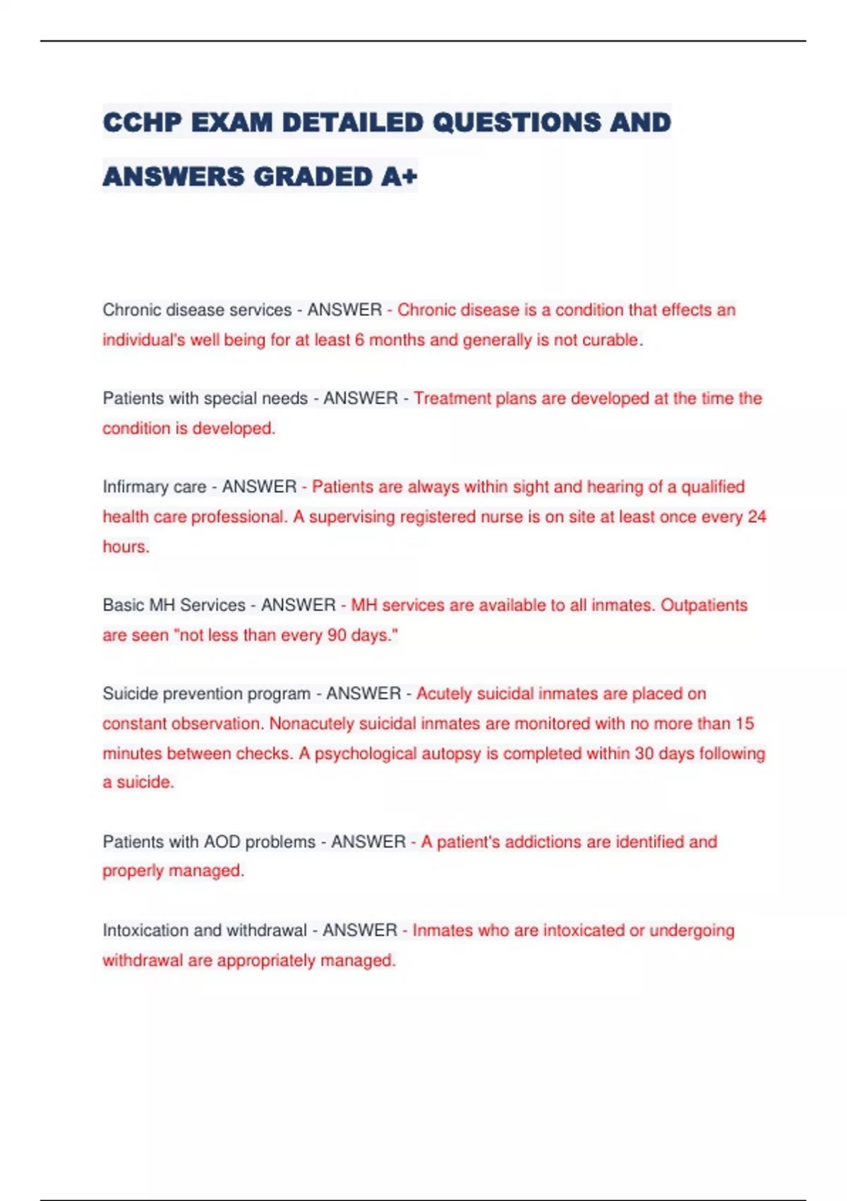 CCHP EXAM DETAILED QUESTIONS AND ANSWERS GRADED A+ Chronic disease services - ANSWER - Chronic disease is a condition that effects an individual's well being for at least 6 months and generally is not curable. Patients with special needs - ANSWER - Treatment plans are developed at the time the condition is developed. Infirmary care - ANSWER - Patients are always within sight and hearing of a qualified health care professional. A supervising registered nurse is on site at least once every 24 hours. Basic MH Services - ANSWER - MH services are available to all inmates. Outpatients are seen "not less than every 90 days." Suicide prevention program - ANSWER - Acutely suicidal inmates are placed on constant observation. Nonacutely suicidal inmates are monitored with no more than 15 minutes between checks. A psychological autopsy is completed within 30 days following a suicide. Patients with AOD problems - ANSWER - A patient's addictions are identified and properly managed. Intoxication and withdrawal - ANSWER - Inmates who are intoxicated or undergoing withdrawal are appropriately managed. Contraception - ANSWER - Emergency contraception and continued contraception is available when medically necessary. Counseling and care of the pregnant inmate - ANSWER - Counseling and assistance are provided in accordance with the inmate's expressed desires. Restraints are not used during active labor and delivery. Restraint during other pre- and postpartum periods should be avoided. Restraints are to be removed when a medical professional determines it is medically necessary. Aids to impairment - ANSWER - Orthoses, prostheses and other aids to impairment are supplied in a timely manner. Where they are contraindicated for security reasons, alternatives are considered. Care for the terminally ill - ANSWER - Treatment includes pain management and palliative care. Consistent with state regulations, professionals initiate or facilitate early release for terminally ill patients. Health record format and contents - ANSWER - A health record is properly created and maintained. Access to Care - ANSWER - A patient can be seen by a clinician in a timely manner. Responsible Health Authority (RHA) - ANSWER - The RHA functions to ensure that health services are organized, adequate and efficient. Medical Autonomy - ANSWER - Clinical decisions are made for clinical purposes and without interference from other personnel. (The non medical considerations needed to carry out such clinical decisions are made in cooperation with custody staff). Administrative Meetings & Reports - ANSWER - Administrative meetings are held at least quarterly. Health staff meetings occur at least monthly. Statistical reports are made at least monthly. Policies & Procedures - ANSWER - They are site specific. Reviewed at least annually. Policies cross reference an NCCHC standard. CQI Program - ANSWER - CQI Committee meets no less than quarterly. Initiates process and/or outcome CQI studies. Emergency Response Plan - ANSWER - At least one mass disaster and one man down drill is conducted annually so every shift participates within 3 years. (Classroom or tabletop exercises do not meet the standard.) Communication on patients' health needs - ANSWER - Health and custody staff communicate about inmates with special needs conditions, including health needs that may effect housing, work, program assignments, disciplinary measures and admissions to or transfers from institutions. Privacy of Care - ANSWER - Discussions regarding patient care occur in private. Clinical treatment encounters occur in private. Procedure in the event of an inmate death - ANSWER - All deaths are reviewed within 30 days. A death review consists of: An administrative review; A mortality review; and a psychological autopsy if the death was a suicide. Grievance mechanism for health complaints - ANSWER - Responses are timely and based on principles of adequate medical care. Infection Control - ANSWER - An exposure control plan is reviewed and updated annually. Patient Safety - ANSWER - Systems are in place to prevent adverse and near miss clinical events.