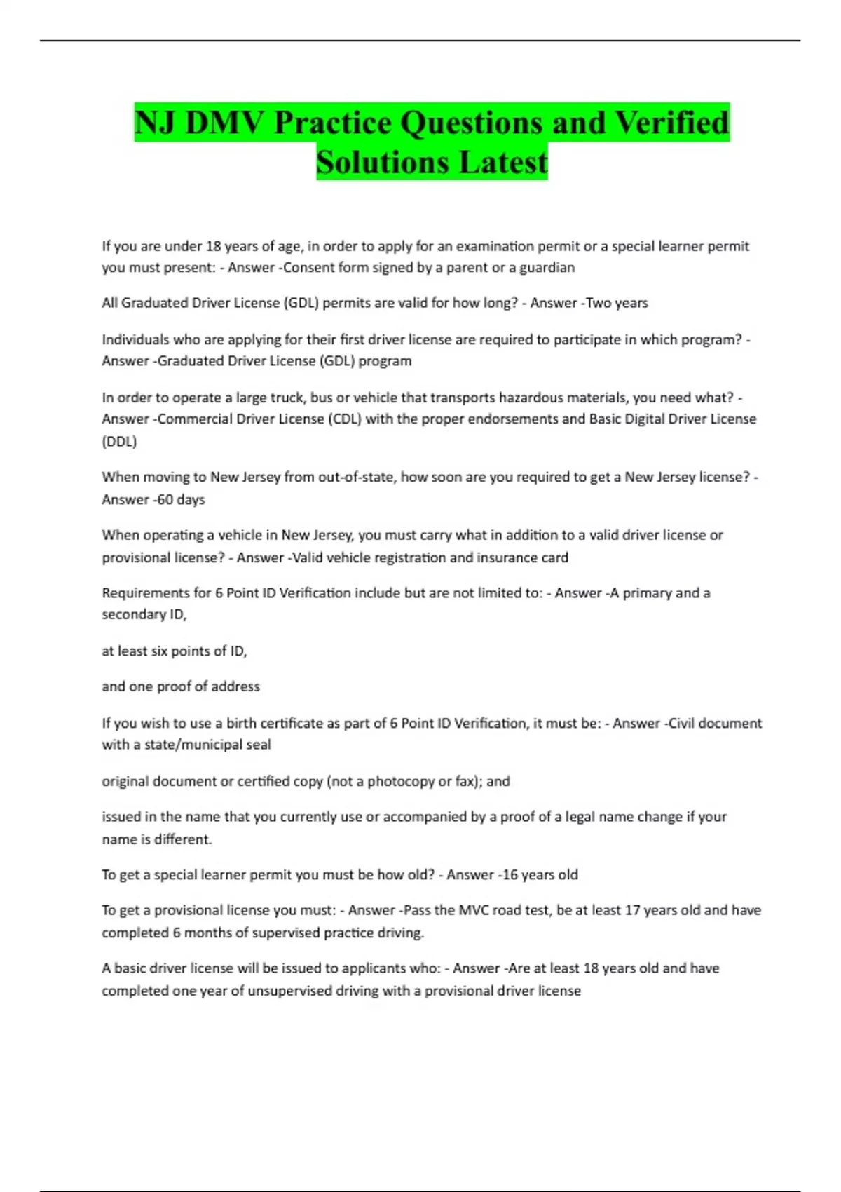 NJ DMV Practice Questions and Verified Solutions Latest If you are under 18 years of age, in order to apply for an examination permit or a special learner permit you must present: - Answer -Consent form signed by a parent or a guardian All Graduated Driver License (GDL) permits are valid for how long? - Answer -Two years Individuals who are applying for their first driver license are required to participate in which program? - Answer -Graduated Driver License (GDL) program In order to operate a large truck, bus or vehicle that transports hazardous materials, you need what? - Answer -Commercial Driver License (CDL) with the proper endorsements and Basic Digital Driver License (DDL) When moving to New Jersey from out-of-state, how soon are you required to get a New Jersey license? - Answer -60 days When operating a vehicle in New Jersey, you must carry what in addition to a valid driver license or provisional license? - Answer -Valid vehicle registration and insurance card Requirements for 6 Point ID Verification include but are not limited to: - Answer -A primary and a secondary ID, at least six points of ID, and one proof of address If you wish to use a birth certificate as part of 6 Point ID Verification, it must be: - Answer -Civil document with a state/municipal seal original document or certified copy (not a photocopy or fax); and issued in the name that you currently use or accompanied by a proof of a legal name change if your name is different. To get a special learner permit you must be how old? - Answer -16 years old To get a provisional license you must: - Answer -Pass the MVC road test, be at least 17 years old and have completed 6 months of supervised practice driving. A basic driver license will be issued to applicants who: - Answer -Are at least 18 years old and have completed one year of unsupervised driving with a provisional driver licenseThe restrictions for a special learner permit prohibit driving - Answer -Between 11:01 p.m. and 5:01 a.m. With more than one person who is not from the special learner permit holder's household; and without an Adult Supervising Driver who must be 21 years of age, possess a valid NJ license and have a minimum of three years driving experience. To take a road test at a Driver Testing Center, an applicant must: - Answer -Provide a vehicle with a vali