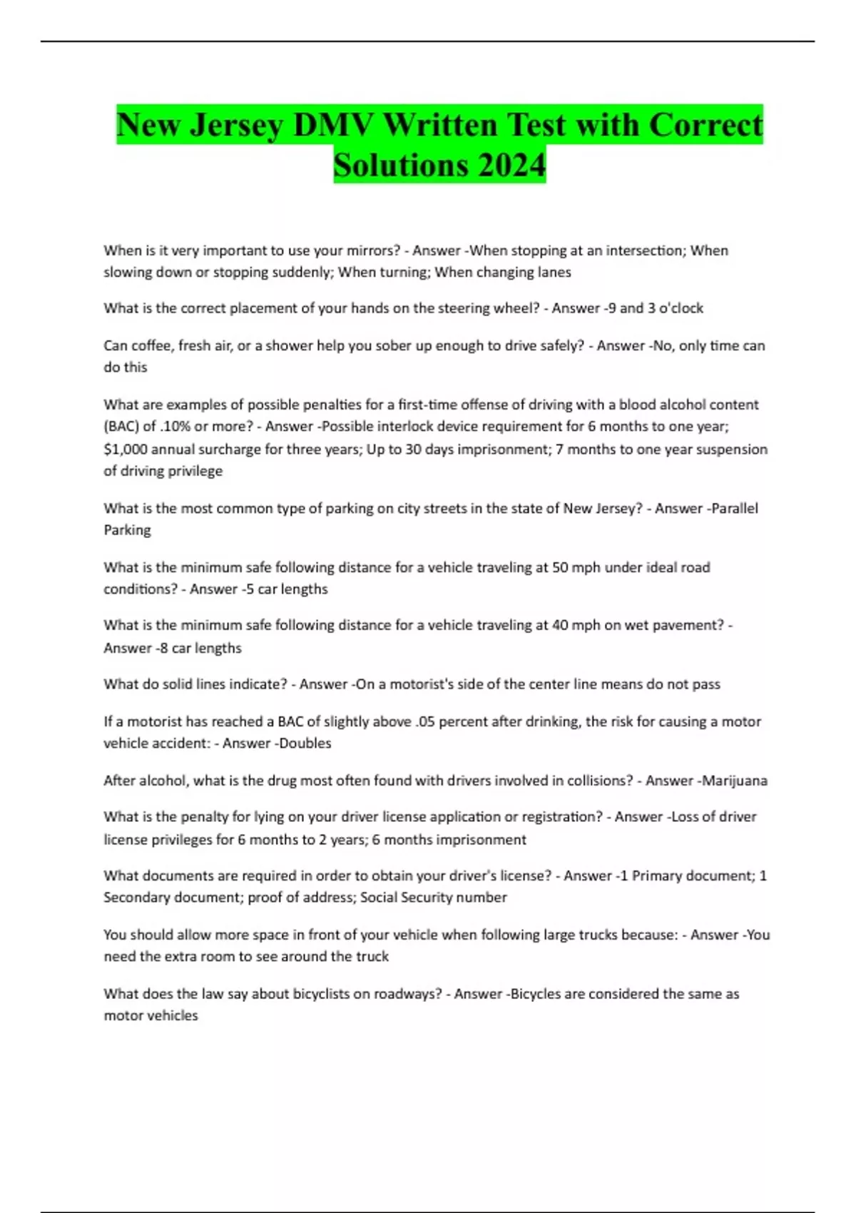 New Jersey DMV Written Test with Correct Solutions 2024 When is it very important to use your mirrors? - Answer -When stopping at an intersection; When slowing down or stopping suddenly; When turning; When changing lanes What is the correct placement of your hands on the steering wheel? - Answer -9 and 3 o'clock Can coffee, fresh air, or a shower help you sober up enough to drive safely? - Answer -No, only time can do this What are examples of possible penalties for a first-time offense of driving with a blood alcohol content (BAC) of .10% or more? - Answer -Possible interlock device requirement for 6 months to one year; $1,000 annual surcharge for three years; Up to 30 days imprisonment; 7 months to one year suspension of driving privilege What is the most common type of parking on city streets in the state of New Jersey? - Answer -Parallel Parking What is the minimum safe following distance for a vehicle traveling at 50 mph under ideal road conditions? - Answer -5 car lengths What is the minimum safe following distance for a vehicle traveling at 40 mph on wet pavement? - Answer -8 car lengths What do solid lines indicate? - Answer -On a motorist's side of the center line means do not pass If a motorist has reached a BAC of slightly above .05 percent after drinking, the risk for causing a motor vehicle accident: - Answer -Doubles After alcohol, what is the drug most often found with drivers involved in collisions? - Answer -Marijuana What is the penalty for lying on your driver license application or registration? - Answer -Loss of driver license privileges for 6 months to 2 years; 6 months imprisonment What documents are required in order to obtain your driver's license? - Answer -1 Primary document; 1 Secondary document; proof of address; Social Security number You should allow more space in front of your vehicle when following large trucks because: - Answer -You need the extra room to see around the truck What does the law say about bicyclists on roadways? - Answer -Bicycles are considered the same as motor vehicles