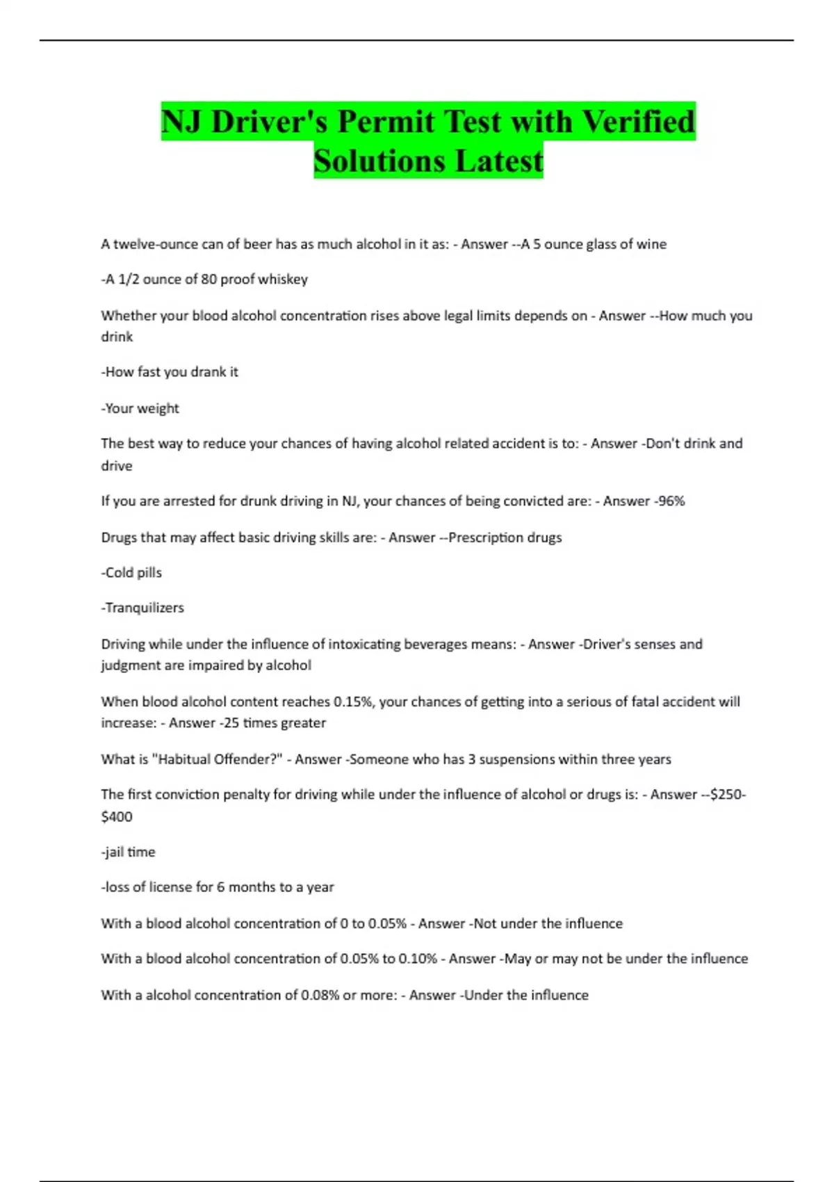 NJ Driver's Permit Test with Verified Solutions Latest A twelve-ounce can of beer has as much alcohol in it as: - Answer --A 5 ounce glass of wine -A 1/2 ounce of 80 proof whiskey Whether your blood alcohol concentration rises above legal limits depends on - Answer --How much you drink -How fast you drank it -Your weight The best way to reduce your chances of having alcohol related accident is to: - Answer -Don't drink and drive If you are arrested for drunk driving in NJ, your chances of being convicted are: - Answer -96% Drugs that may affect basic driving skills are: - Answer --Prescription drugs -Cold pills -Tranquilizers Driving while under the influence of intoxicating beverages means: - Answer -Driver's senses and judgment are impaired by alcohol When blood alcohol content reaches 0.15%, your chances of getting into a serious of fatal accident will increase: - Answer -25 times greater What is "Habitual Offender?" - Answer -Someone who has 3 suspensions within three years The first conviction penalty for driving while under the influence of alcohol or drugs is: - Answer --$250- $400 -jail time -loss of license for 6 months to a year With a blood alcohol concentration of 0 to 0.05% - Answer -Not under the influence With a blood alcohol concentration of 0.05% to 0.10% - Answer -May or may not be under the influence With a alcohol concentration of 0.08% or more: - Answer -Under the influenceNJ licensed drivers must take an eyesight recheck: -