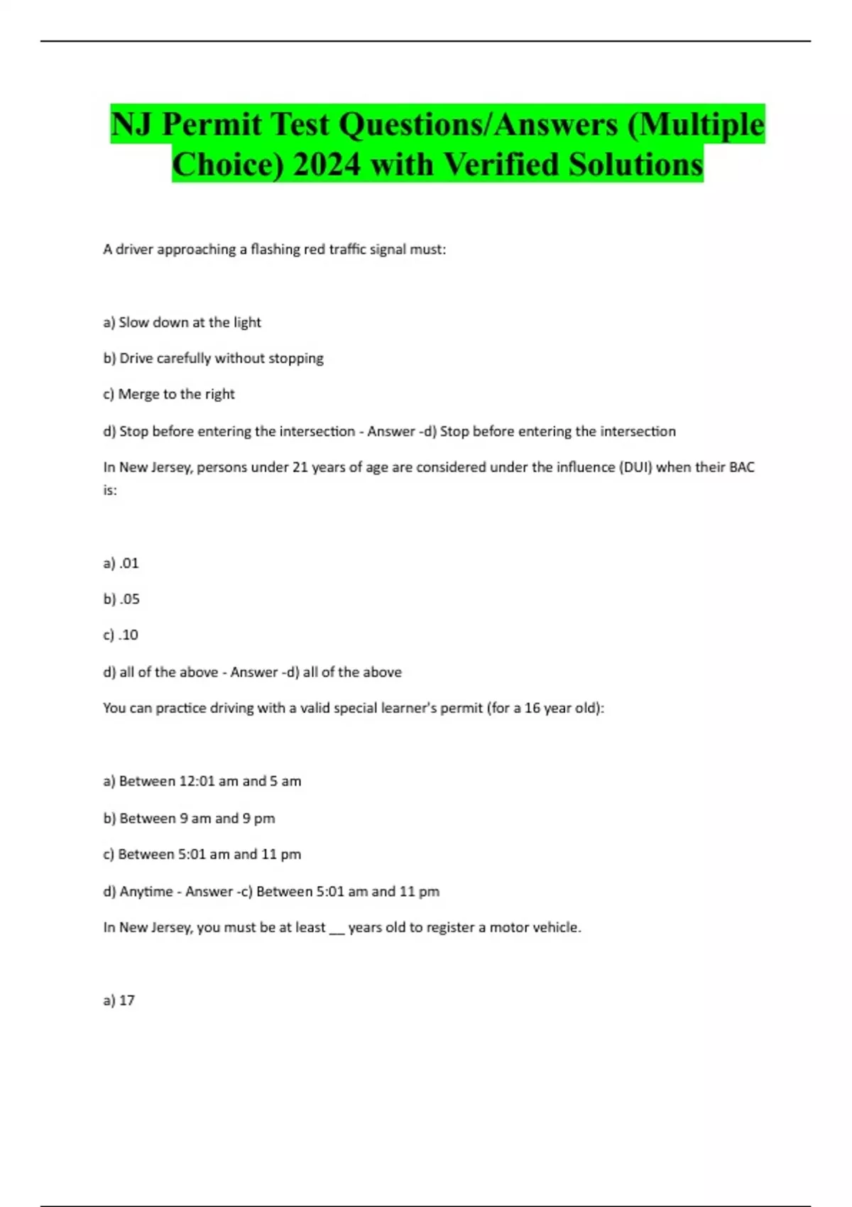 NJ PERMIT TEST QUESTIONS/ANSWERS (MULTIPLE CHOICE) ACTUAL 2025/2026 LATEST UPDATE 100% PASS A driver approaching a flashing red traffic signal must: a) Slow down at the light b) Drive carefully without stopping c) Merge to the right d) Stop before entering the intersection - Answer -d) Stop before entering the intersection In New Jersey, persons under 21 years of age are considered under the influence (DUI) when their BAC is: a) .01Need assistance on Online classes, Exams & Assignments? Reach out for instant help!! Full Course Assistance, Plagiarism-free Essay Writing, Research Paper, Dissertation, Discussion Posts, etc…. Confidential & Secure services. Tutors are available for all subjects! Email now at: b) .05 c) .10 d) all of the above - Answer -d) all of the above You can practice driving with a valid special learner's permit (for a 16 year old): a) Between 12:01 am and 5 am b) Between 9 am and 9 pm c) Between 5:01 am and 11 pm d) Anytime - Answer -c) Between 5:01 am and 11 pm In New Jersey, you must be at least __ years old to register a motor vehicle. a) 17 b) 16 c) 15 d) 21 - Answer -a) 17 As you drive, you are required to stop your vehicle:a) At an intersection with a stop sign b) Where there is a red light c) When a traffic officer orders you to stop d) All of the above - Answer -d) All of the above As you drive, you must turn your headlights on: a) When you turn your wipers on b) One-half hour after sunset c) One-half hour before sunrise d) All of the above - Answer -d) All of the above You must yield for emergency vehicl