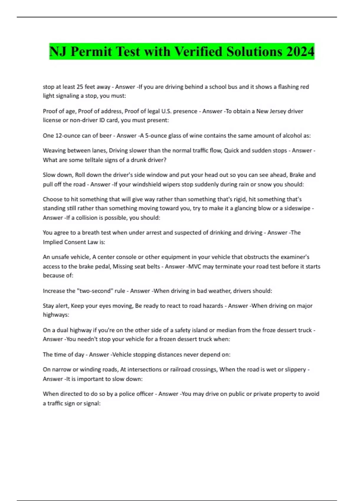 NJ Permit Test with Verified Solutions 2024 stop at least 25 feet away - Answer -If you are driving behind a school bus and it shows a flashing red light signaling a stop, you must: Proof of age, Proof of address, Proof of legal U.S. presence - Answer -To obtain a New Jersey driver license or non-driver ID card, you must present: One 12-ounce can of beer - Answer -A 5-ounce glass of wine contains the same amount of alcohol as: Weaving between lanes, Driving slower than the normal traffic flow, Quick and sudden stops - Answer - What are some telltale signs of a drunk driver? Slow down, Roll down the driver's side window and put your head out so you can see ahead, Brake and pull off the road - Answer -If your windshield wipers stop suddenly during rain or snow you should: Choose to hit something that will give way rather than something that's rigid, hit something that's standing still rather than something moving toward you, try to make it a glancing blow or a sideswipe - Answer -If a collision is possible, you should: You agree to a breath test when under arrest and suspected of drinking and driving - Answer -The Implied Consent Law is: An unsafe vehicle, A center console or other equipment in your vehicle that obstructs the examiner's access to the brake pedal, Missing seat belts - Answer -MVC may terminate your road test before it starts because of: