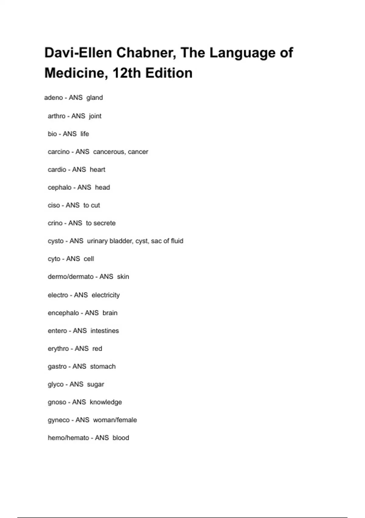 Davi-Ellen Chabner, The Language of Medicine, 12th Edition adeno - ANS gland arthro - ANS joint bio - ANS life carcino - ANS cancerous, cancer cardio - ANS heart cephalo - ANS head ciso - ANS to cut crino - ANS to secrete cysto - ANS urinary bladder, cyst, sac of fluid cyto - ANS cell dermo/dermato - ANS skin electro - ANS electricity encephalo - ANS brain entero - ANS intestines erythro - ANS red gastro - ANS stomach glyco - ANS sugar gnoso - ANS knowledge gyneco - ANS woman/female hemo/hemato - ANS blood hepato - ANS liver