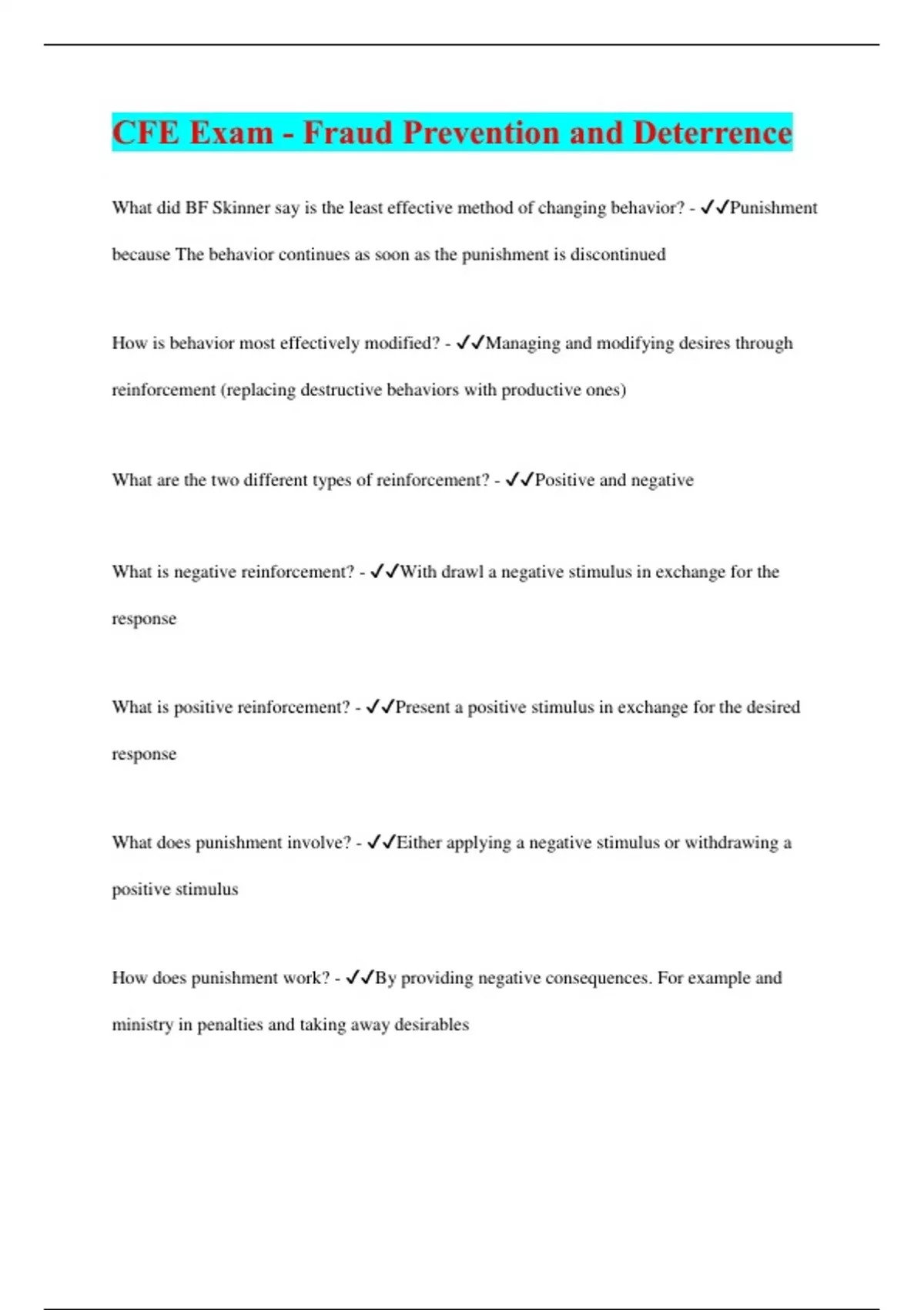 CFE Exam - Fraud Prevention and Deterrence What did BF Skinner say is the least effective method of changing behavior? - Punishment because The behavior continues as soon as the punishment is discontinued How is behavior most effectively modified? - Managing and modifying desires through reinforcement (replacing destructive behaviors with productive ones) What are the two different types of reinforcement? - Positive and negative What is negative reinforcement? - With drawl a negative stimulus in exchange for the response What is positive reinforcement? - Present a positive stimulus in exchange for the desired response What does punishment involve? - Either applying a negative stimulus or withdrawing a positive stimulus How does punishment work? - By providing negative consequences. For example and ministry in penalties and taking away desirables What does Skinner say about conditioning? - We can condition incompatible behavior that interferes with a persons usually acts by encouraging the improper behaviors opposite (rewarding a for child controlling outbursts) What can you do to condition fraudsters? - Reward honesty, openness, and cooperation What is the theory of differential association? - deviance is learned behavior that results from continual exposure to others who violate norms; What are the main points of theory of differential association? Edwin Sutherland - 1. Criminal behavior is learned 2. Acquired through communication and personal groups 3. Learning differs from pure invitation 4. Criminal behavior is an expression of general needs and values 5. Motives and drives are learned from definitions of legal codes as being favorable or unfavorable What is social control theory? - A persons chances of violating the law are increased when a person fails to become attached to the variety of control agencies of the society Under social control theory, what are people likely to ask themselves when possibly violating the law? - What will my spouse or my mother or father think if they find out? Under social control theory, what deters people from committing criminal acts? - People whose opinion or important to them will be disappointed or shamed. They feel deeply about what these people think What does differential reinforcement theory state? - Criminal behavior is begun or persists depending on the degree that is being rewarded or punished, as well as the rewards or punishments attached to his alternative What does differential reinforcement theory say about behavior? - Behavior is reinforced with positive rewards are gained or punishment is avoided What type of behavior is differential reinforcement theory? - Learned behavior What is white collar crime? - The violators position of economic power, influence, or trust in a legitimate economic or political institution order for the purpose of illegal gain What is organizational opportunity? - Organization and complexity make a larger different then the offenders social status What are some aspects of trials of