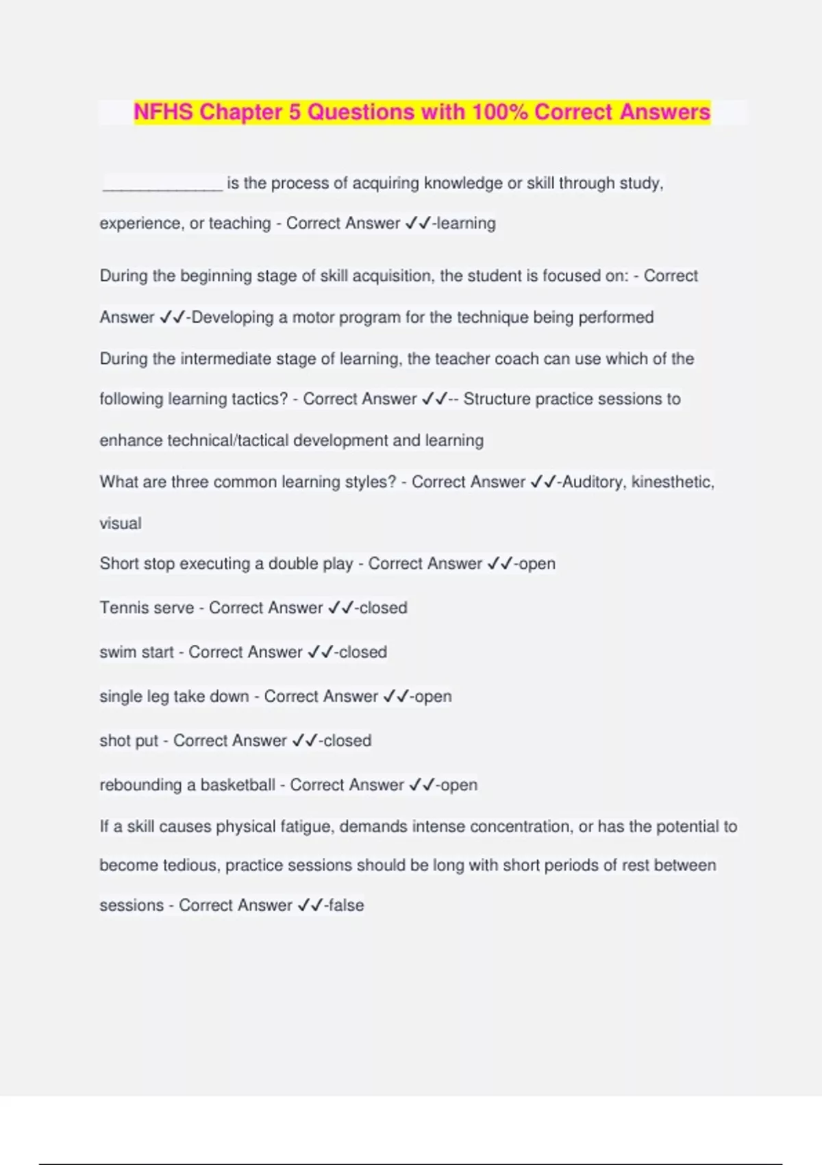 NFHS Chapter 5 Questions with 100% Correct Answers _____________ is the process of acquiring knowledge or skill through study, experience, or teaching - Correct Answer ️️ -learning During the beginning stage of skill acquisition, the student is focused on: - Correct Answer ️️ -Developing a motor program for the technique being performed During the intermediate stage of learning, the teacher coach can use which of the following learning tactics? - Correct Answer ️️ -- Structure practice sessions to enhance technical/tactical development and learning What are three common learning styles? - Correct Answer ️️ -Auditory, kinesthetic, visual Short stop executing a double play - Correct Answer ️️ -open Tennis serve - Correct Answer ️️ -closed