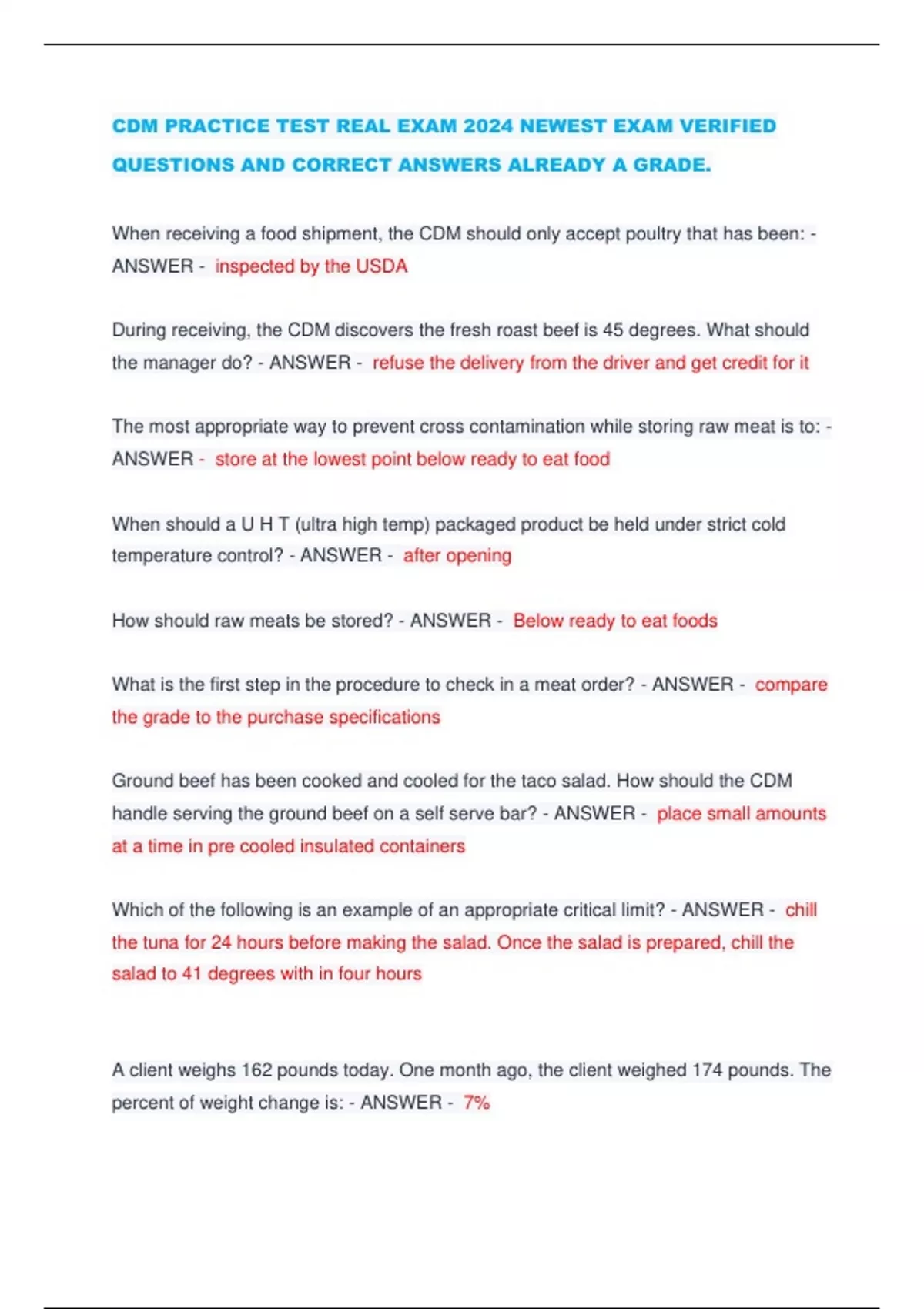 CDM PRACTICE TEST REAL EXAM 2024 NEWEST EXAM VERIFIED QUESTIONS AND CORRECT ANSWERS ALREADY A GRADE. When receiving a food shipment, the CDM should only accept poultry that has been: - ANSWER - inspected by the USDA During receiving, the CDM discovers the fresh roast beef is 45 degrees. What should the manager do? - ANSWER - refuse the delivery from the driver and get credit for it The most appropriate way to prevent cross contamination while storing raw meat is to: - ANSWER - store at the lowest point below ready to eat food When should a U H T (ultra high temp) packaged product be held under strict cold temperature control? - ANSWER - after opening How should raw meats be stored? - ANSWER - Below ready to eat foods What is the first step in the procedure to check in a meat order? - ANSWER - compare the grade to the purchase specifications