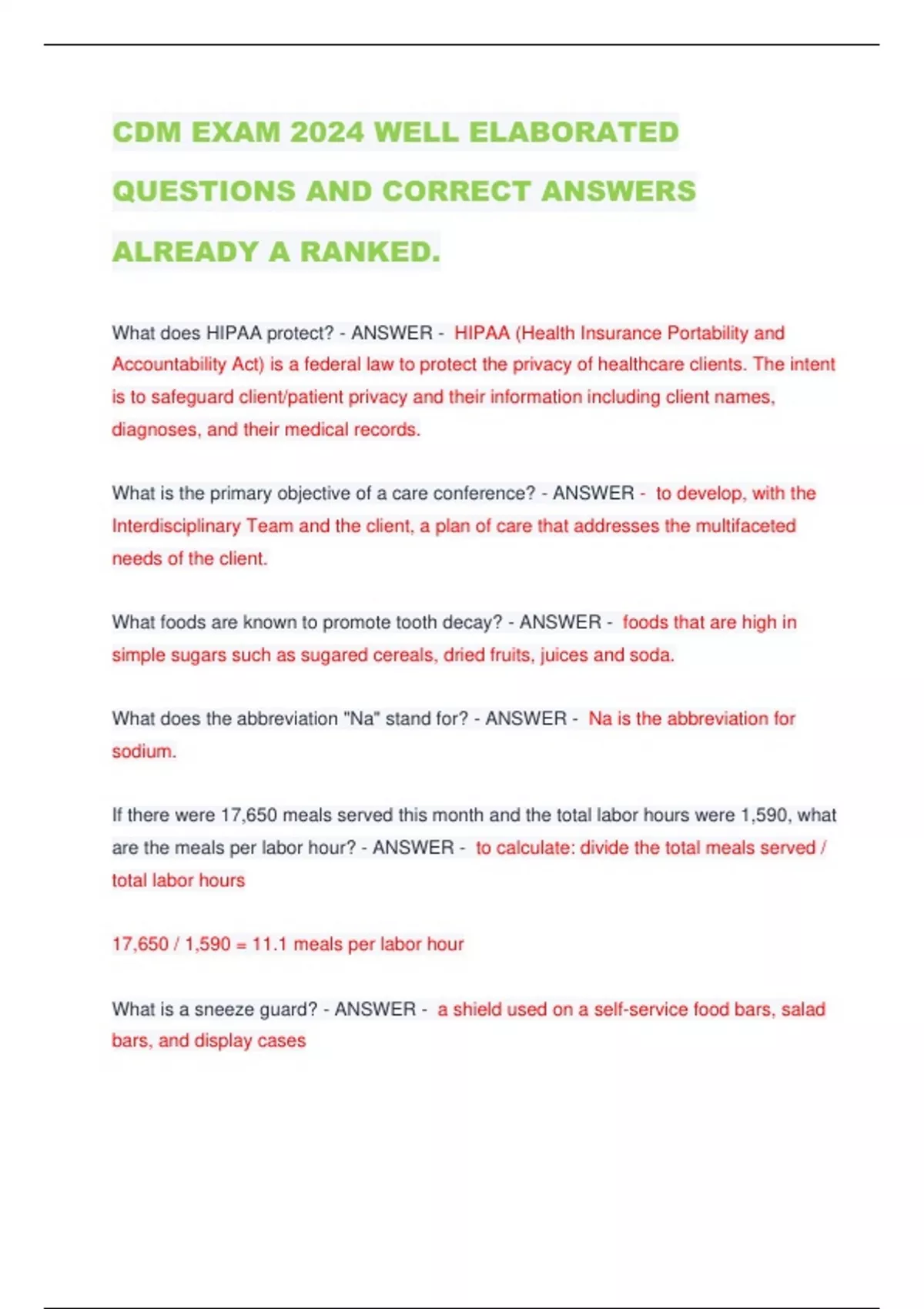 CDM EXAM 2024 WELL ELABORATED QUESTIONS AND CORRECT ANSWERS ALREADY A RANKED. What does HIPAA protect? - ANSWER - HIPAA (Health Insurance Portability and Accountability Act) is a federal law to protect the privacy of healthcare clients. The intent is to safeguard client/patient privacy and their information including client names, diagnoses, and their medical records. What is the primary objective of a care conference? - ANSWER - to develop, with the Interdisciplinary Team and the client, a plan of care that addresses the multifaceted needs of the client. What foods are known to promote tooth decay? - ANSWER - foods that are high in simple sugars such as sugared cereals, dried fruits, juices and soda. What does the abbreviation "Na" stand for? - ANSWER - Na is the abbreviation for sodium.