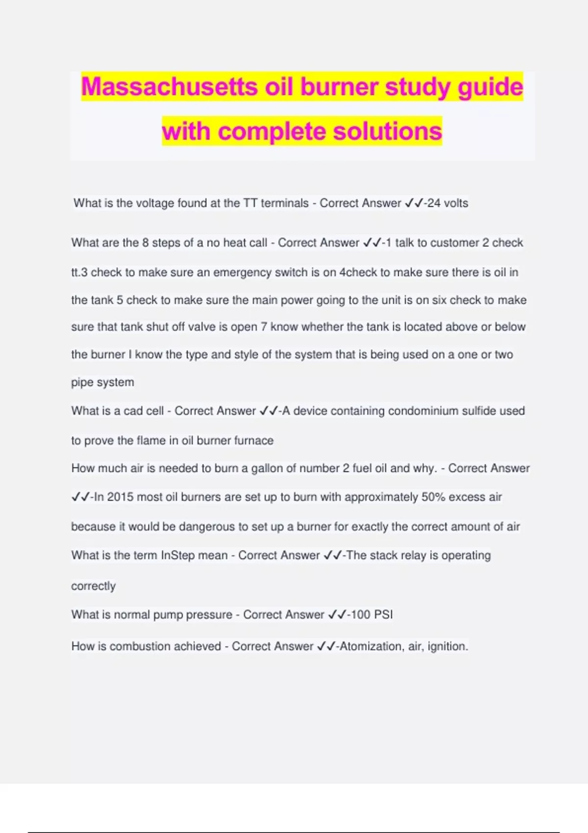 Massachusetts oil burner study guide with complete solutions What is the voltage found at the TT terminals - Correct Answer ️️ -24 volts What are the 8 steps of a no heat call - Correct Answer ️️ -1 talk to customer 2 check tt.3 check to make sure an emergency switch is on 4check to make sure there is oil in the tank 5 check to make sure the main power going to the unit is on six check to make sure that tank shut off valve is open 7 know whether the tank is located above or below the burner I know the type and style of the system that is being used on a one or two pipe system What is a cad cell - Correct Answer ️️ -A device containing condominium sulfide used to prove the flame in oil burner furnace How much air is needed to burn a gallon of number 2 fuel oil and why. - Correct Answer ️️ -In 2015 most oil burners are set up to burn with approximately 50% excess air because it would be dangerous to set up a burner for exactly the correct amount of air What is the term InStep mean - Correct Answer ️️ -The stack relay is operating correctly What is normal pump pressure - Correct Answer ️️ -100 PSI How is combustion achieved - Correct Answer ️️ -Atomization, air, ignition. What is primary air and secondary air - Correct Answer ️️ -Primary air, air that is introduced to a furnace burner before the combustion process has taken place. secondary air, air that is introduced to the furnace after combustion has taken place and that supports combustion How should an oil tank be supported - Correct Answer ️️ -It shall be secured attached to a non-combustible supports What is the wire gauge use an oil burner circuits - Correct Answer ️️ -14 gauge 15 amp fuse How is an oil burner wired - Correct Answer ️️ -Shall be wired on its own circuit. All protective control and emergency devices shall be series connected in the grounded line conductors. all the electrical wiring shall be in accordance with 527 CMR 12.00 Massachusetts electrical code What size vent pipe is required with a 2 inch fill pipe - Correct Answer ️️ -A fill pipe shall not be greater than the vent pipe. The minimum the fill pipe in the state of Massachusetts is one and one quarter inch. Explain interrupted ignition - Correct Answer ️️ -the ignition Transformer drops out of the circuit once a flame is established What are the elements are found in fuel oil number 2 - Correct Answer ️️ -Carbon hydrogen oxygen and hydrocarbons What is a BTU - Correct Answer ️️ -A British thermal unit is the amount of heat needed to raise one pound of water 1 degree Fahrenheit How many BTUs are in one gallon number 2 fuel oil - Correct Answer ️️ -140,000 BTUs What determines the gallons per hour of a nozzle - Correct Answer ️️ -Manufacturer ,the bore size, pump pressure or Orphus What is a series circuit - Correct Answer ️️ -an electrical or piping circuit where all of the current or fluid flows through the entire circuit What is a degree day - Correct Answer ️️ -The average temp for the day - 65 What is the flash point of number 2 fuel oil - C