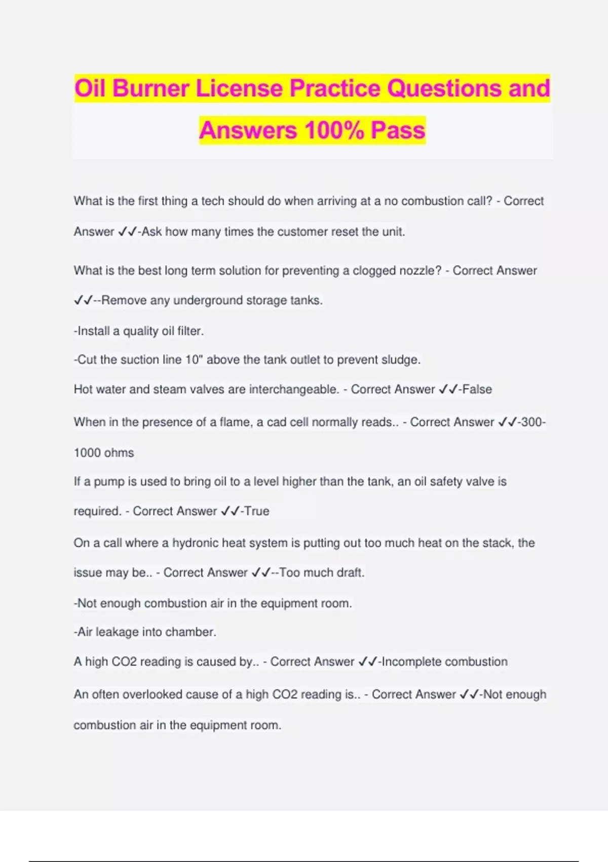Oil Burner License Practice Questions and Answers 100% Pass What is the first thing a tech should do when arriving at a no combustion call? - Correct Answer ️️ -Ask how many times the customer reset the unit. What is the best long term solution for preventing a clogged nozzle? - Correct Answer ️️ --Remove any underground storage tanks. -Install a quality oil filter. -Cut the suction line 10" above the tank outlet to prevent sludge. Hot water and steam valves are interchangeable. - Correct Answer ️️ -False When in the presence of a flame, a cad cell normally reads.. - Correct Answer ️️ -300- 1000 ohms If a pump is used to bring oil to a level higher than the tank, an oil safety valve is required. - Correct Answer ️️ -True On a call where a hydronic heat system is putting out too much heat on the stack, the issue may be.. - Correct Answer ️️ --Too much draft. -Not enough combustion air in the equipment room. -Air leakage into chamber. A high CO2 reading is caused by.. - Correct Answer ️️ -Incomplete combustion An often overlooked cause of a high CO2 reading is.. - Correct Answer ️️ -Not enough combustion air in the equipment room. When multiple pumps are wired together in a heating system, they should be wired in.. - Correct Answer ️️ -parallel In a series circuit.. - Correct Answer ️️ -Current has one path. When 2 burners are connected to the same chimney.. - Correct Answer ️️ -Sufficient draft must be obtained to operate both units. The ignition transformer is located.. - Correct Answer ️️ -In the primary control. When safeties are wired in series one safety will affect the operation of the others. - Correct Answer ️️ -True A stack switch is no longer allowed to be installed or replaced because.. - Correct Answer ️️ -It's safety cutout time is higher than what is now required. What is a power venter and what does it do? - Correct Answer ️️ -An electrical device that sends fluid gases into the chimney connector. A burner in a confined space using 1 GPH of #2 fuel oil requires what size permanent opening for combustion air? - Correct Answer ️️ -140" The difference between an adjustable flame retention burner and a fixed flame retention burner is? - Correct Answer ️️ -Air inlets can be adjusted Ignitor position can be adjusted Fuel can be adjusted Oil tank design, construction, installation and testing shall be in accordance with.. - Correct Answer ️️ -527 CMR 9.0 Heat is a form of.. - Correct Answer ️️ -Energy If a burner is operational but the circulator pump isn't running.. - Correct Answer ️️ - The pump relay is not working correctly A method of dealing with low viscosity/cold temps with #2 oil? - Correct Answer ️️ - Increase pump pressure/ decrease nozzle size What is needed at the outlet of an oil tank? - Correct Answer ️️ -Thermal safety valve Where do you obtain an installation permit for oil burners? - Correct Answer ️️ -Fire Dept How many Btu's approximately in 1 gal of #2 fuel oil? - Correct Answer ️️ -140,000 btu's Solid state ignition is superior to spark because - Correct Answer ️️ -It is not affected by reduced voltage What is an installation? - Correct Answer ️️ -The complete setting in place, ready for operation, of an oil burner appliance together with its accessories and equipment. How far must a power vent terminate from an opening or window? - Correct Answer ️️ -4' A pump in a one pipe system that is full of air can be self purged. - Correct Answer ️️ - False List the minimum size of an oil supply line. - Correct Answer ️️ -3/8" A material with electrons so loose it allows voltage to pass with little or no resistance.. - Correct Answer ️️ -Is a conductor If a high limit goes off, what does a low water switch do? - Correct Answer ️️ - Maintains water temperature What is flashpoint an indicator of? - Correct Answer ️️ -Minimum temperature oil will ignite but not continue to burn. What travels on the inside of the wire? - Correct Answer ️️ -Volts What does readily accessible mean pertaining to oil burning equipment? - Correct Answer ️️ -Capable of being reached easily and quickly for operation, maintenance or inspection. What is the minimum vent pipe on an oil tank? - Correct Answer ️️ -1 1/4" What causes corrosion on a flue pipe? - Correct Answer ️️ -When the flue pipe is operating below the dew point temperature. What are the methods to prevent oil waxing? - Correct Answer ️️ -Put additives