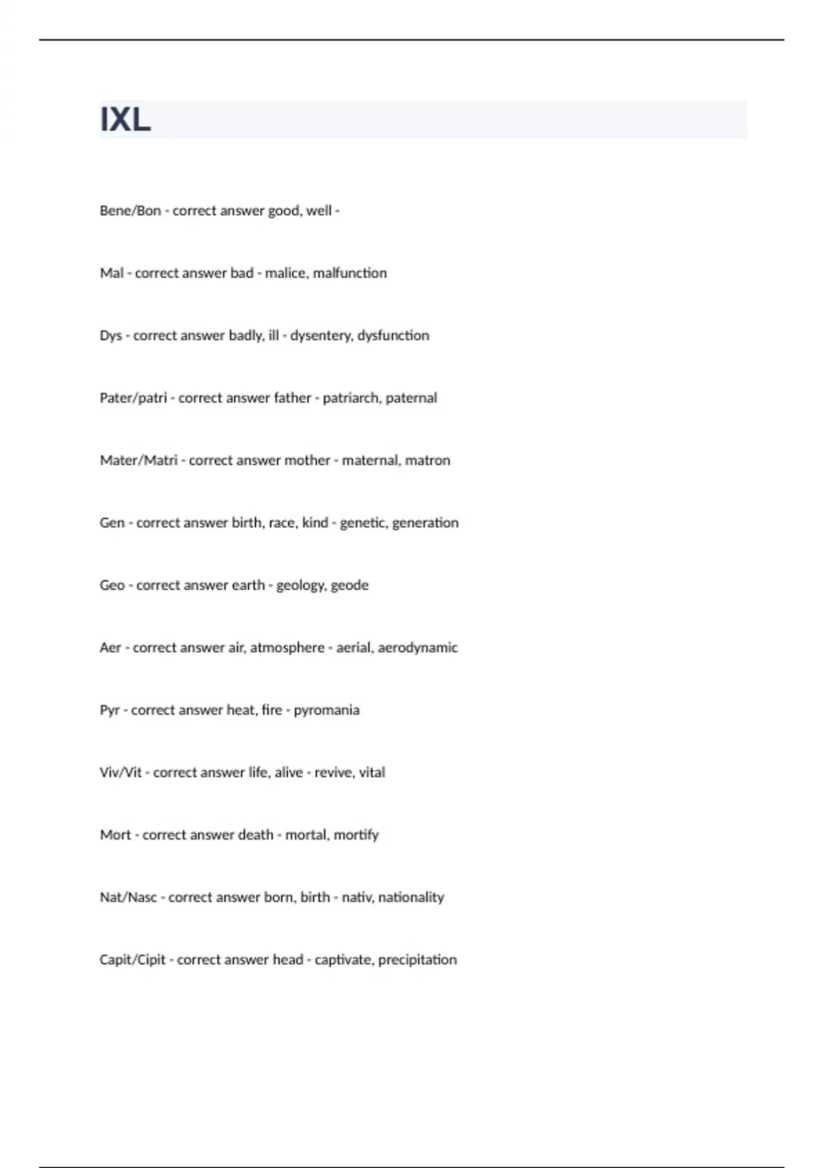 IXL VERIFIED EXAM QUESTIONS 2024. Bene/Bon - correct answer good, well - Mal - correct answer bad - malice, malfunction Dys - correct answer badly, ill - dysentery, dysfunction Pater/patri - correct answer father - patriarch, paternal Mater/Matri - correct answer mother - maternal, matron Gen - correct answer birth, race, kind - genetic, generation Geo - correct answer earth - geology, geode Aer - correct answer air, atmosphere - aerial, aerodynamic Pyr - correct answer heat, fire - pyromania Viv/Vit - correct answer life, alive - revive, vital Mort - correct answer death - mortal, mortify Nat/Nasc - correct answer born, birth - nativ, nationality Capit/Cipit - correct answer head - captivate, precipitation