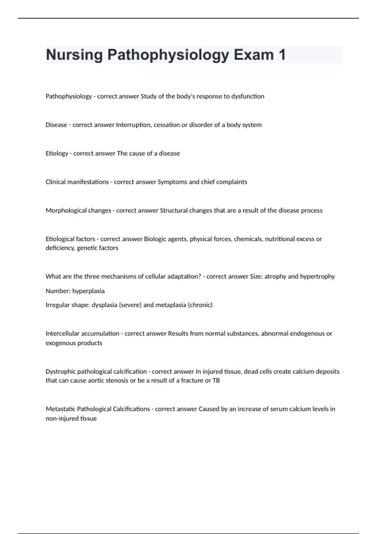 Nursing Pathophysiology Exam 1 Pathophysiology - correct answer Study of the body's response to dysfunction Disease - correct answer Interruption, cessation or disorder of a body system Etiology - correct answer The cause of a disease Clinical manifestations - correct answer Symptoms and chief complaints Morphological changes - correct answer Structural changes that are a result of the disease process Etiological factors - correct answer Biologic agents, physical forces, chemicals, nutritional excess or deficiency, genetic factors What are the three mechanisms of cellular adaptation? - correct answer Size: atrophy and hypertrophy Number: hyperplasia Irregular shape: dysplasia (severe) and metaplasia (chronic) Intercellular accumulation - correct answer Results from normal substances, abnormal endogenous or exogenous products Dystrophic pathological calcification - correct answer In injured tissue, dead cells create calcium deposits that can cause aortic stenosis or be a result of a fracture or TB Metastatic Pathological Calcifications - correct answer Caused by an increase of serum calcium levels in non-injured tissue