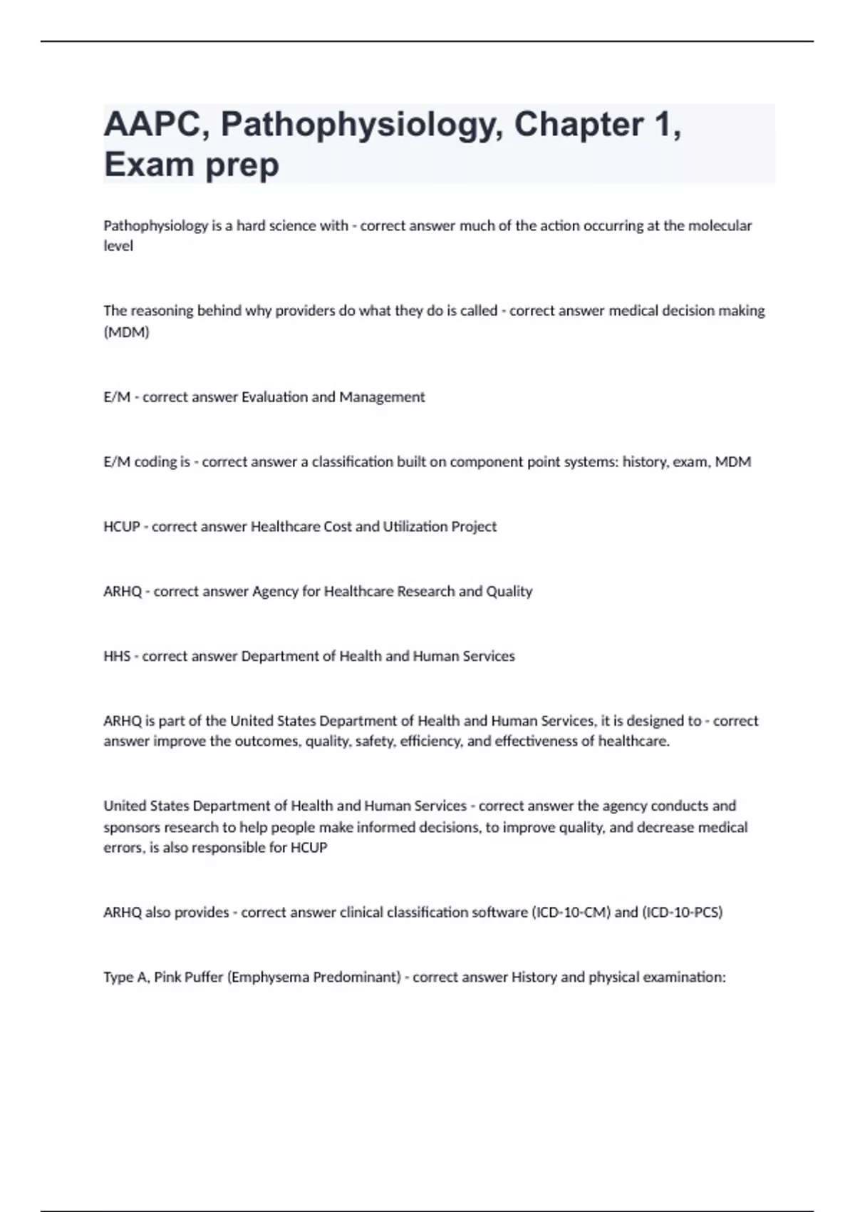 AAPC, Pathophysiology, Chapter 1, Exam prepPathophysiology is a hard science with - correct answer much of the action occurring at the molecular level The reasoning behind why providers do what they do is called - correct answer medical decision making (MDM) E/M - correct answer Evaluation and Management E/M coding is - correct answer a classification built on component point systems: history, exam, MDM HCUP - correct answer Healthcare Cost and Utilization Project ARHQ - correct answer Agency for Healthcare Research and Quality HHS - correct answer Department of Health and Human Services ARHQ is part of the United States Department of Health and Human Services, it is designed to - correct answer improve the outcomes, quality, safety, efficiency, and effectiveness of healthcare. United States Department of Health and Human Services - correct answer the agency conducts and sponsors research to help people make informed decisions, to improve quality, and decrease medical errors, is also responsible for HCUP ARHQ also provides - correct answer clinical classification software (ICD-10-CM) and (ICD-10-PCS) Type A, Pink Puffer (Emphysema Predominant) - correct answer History and physical examination: