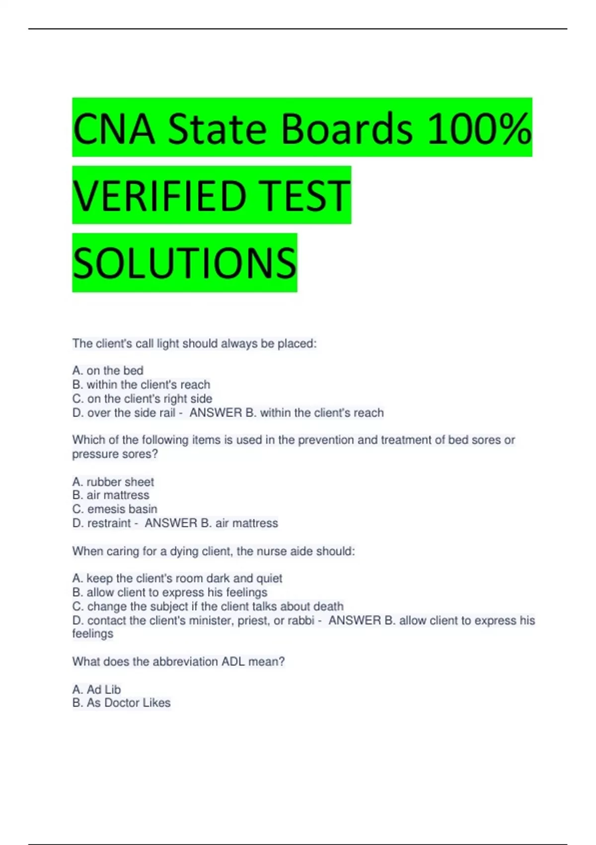 CNA State Boards 100% VERIFIED TEST SOLUTIONS The client's call light should always be placed: A. on the bed B. within the client's reach C. on the client's right side D. over the side rail - ANSWER B. within the client's reach Which of the following items is used in the prevention and treatment of bed sores or pressure sores? A. rubber sheet B. air mattress C. emesis basin D. restraint - ANSWER B. air mattress When caring for a dying client, the nurse aide should: A. keep the client's room dark and quiet B. allow client to express his feelings C. change the subject if the client talks about death D. contact the client's minister, priest, or rabbi - ANSWER B. allow client to express his feelings What does the abbreviation ADL mean? A. Ad Lib B. As Doctor Likes C. Activities of Daily Living D. After Daylight - ANSWER B. Activities of Daily Living After giving a client a back rub, the nurse aide should always note: A. the last time that the client had a back rub B. any change in the client's skin C. client's weight D. amount of lotion used - ANSWER B. any change in the client's skin How should the nurse aide communicate with a client who has hearing loss? A. face the client when speaking B. repeat the statement C. shout so that the client can hear D. use a high-pitched voice - ANSWER A. face the client when speaking Which of the following healthcare settings is generally for people who will die in six months or less? A. Hospice care B. Long-term care C. Outpatient care D. Acute Care - ANSWER A. Hospice care Which of the following statements is true of long-term care? A. People with terminal illnesses do not live in long-term care facilities. B. Most conditions in long-term care facilities are chronic. C. People who live in long-term care facilities are never able to return home. D. Long-term care takes place in a person's home. - ANSWER B. Most conditions in long-term care facilities are chronic. There is an exception for rehabilitation situations. Where is long-term care offered? A. In adult day services facilities B. In hospitals C. In skilled nursing facilities D. In ambulatory surgical centers - ANSWER C. In skilled nursing facilities ___________ is care given by specialists to help restore or improve function after an illness or injury. A. Subacute care B. Acute care C. Adult day services D. Rehabilitation - ANSWER D. Rehabilitation A resident has purchased a special gift for her nursing assistant (NA). What would be the best response by the nursing assistant? A. The NA should refuse the gift but thank the resident for thinking of her. B. The NA should accept the gift because she is unsure about her facility's policy on gifts. C. The NA should accept the gift if the resident will keep it confidential. D. The NA should refuse the gift and tell the resident that her employer is very unfair about employees accepting gifts from residents. - ANSWER A. The NA should refuse the gift but thank the resident for thinking of her. The abbreviation HMO means A. Home maintenance organization B. Health management organization C. Health maintenance organization D. Home medical organization - ANSWER C. Health maintenance organization The group with the longest average stay in long-term care facilities is A. Men B. Developmentally Disabled C. Caregivers D. Residents with heart disease - ANSWER B. Developmentally disabled Which of the following statements is true of acute care? A. Acute care is normally given in adult day services facilities. B. One advantage of acute care is people do not have to leave their homes to receive it. C. Acute care is given to people who do not have a serious illness. D. Acute care is given in hospitals for people who require immediate care. - ANSWER D. Acute care is given in hospitals for people who require immediate care. A ______ is a method or way of doing something. A. Policy B. Procedure C. Survey D. Cite - ANSWER B. Procedure Medicare will pay for A. All care requested by the recipient B. All care requested by the doctor C. All care requested by the long-term care facility D. Only care that it determines to be medically necessary - ANSWER D. Only care tha