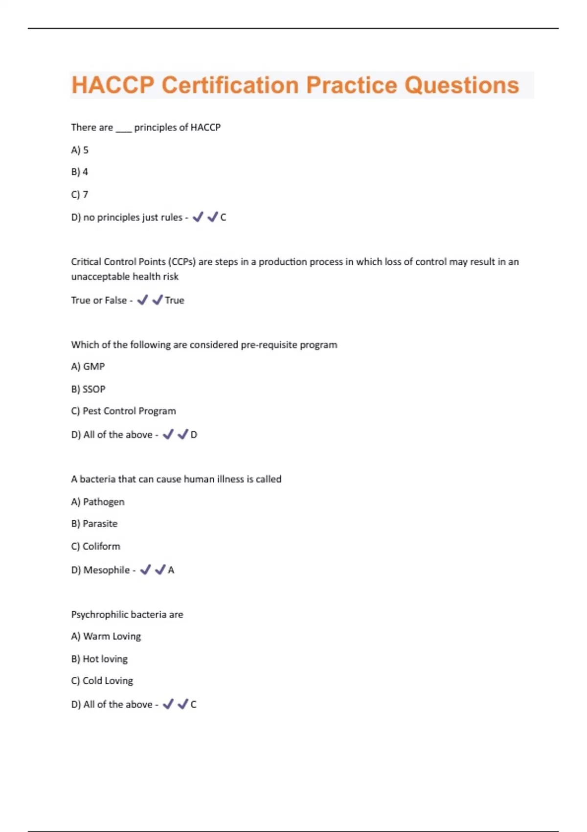 here are ___ principles of HACCP A) 5 B) 4 C) 7 D) no principles just rules - C Critical Control Points (CCPs) are steps in a production process in which loss of control may result in an unacceptable health risk True or False - True Which of the following are considered pre-requisite program A) GMP B) SSOP C) Pest Control Program D) All of the above - D A bacteria that can cause human illness is call