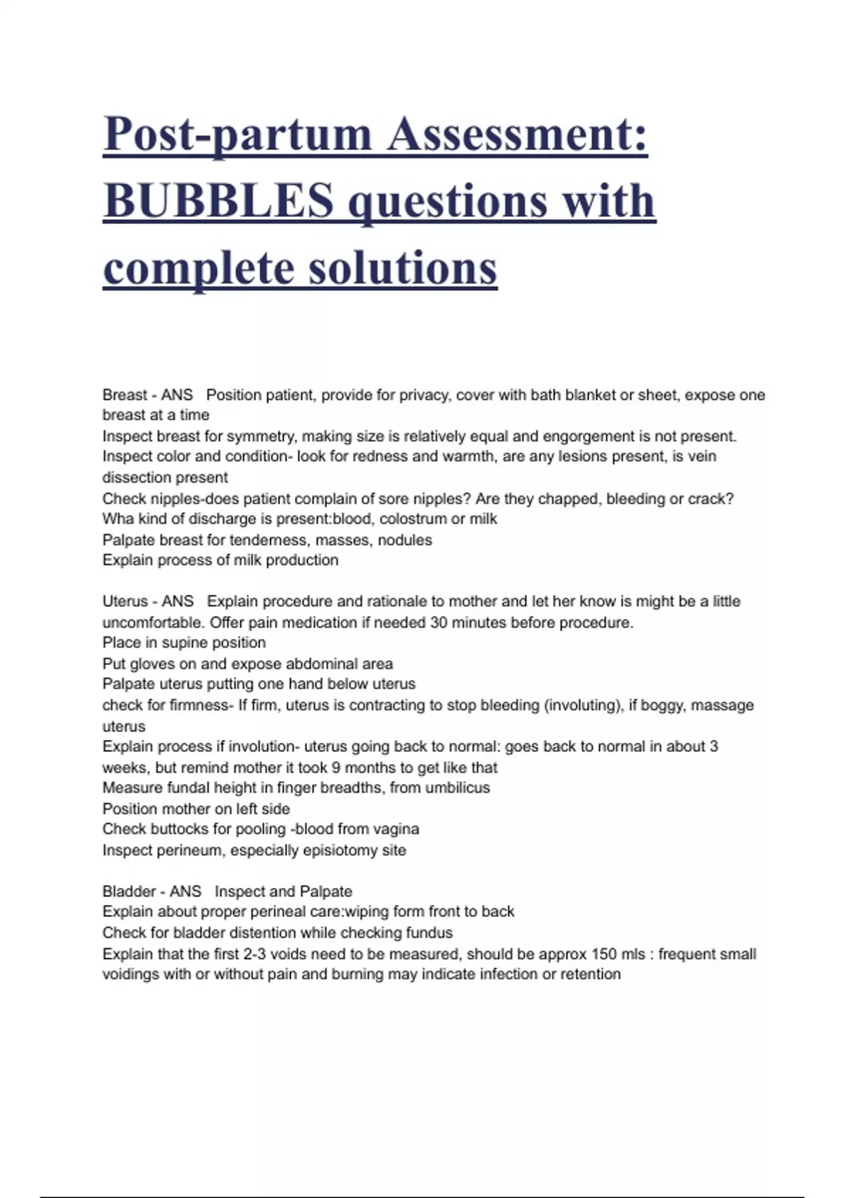 Post-partum Assessment: BUBBLES questions with complete solutions