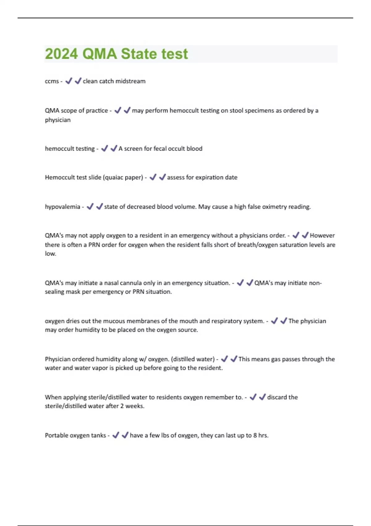 ccms - clean catch midstream QMA scope of practice - may perform hemoccult testing on stool specimens as ordered by a physician hemoccult testing - A screen for fecal occult blood Hemoccult test slide (quaiac paper) - assess for expiration date hypovalemia - state of decreased blood volume. May cause a high false oximetry reading. QMA's may not apply oxygen to a resident in an emergency without a physicians order. - However there is often a PRN order for oxygen when the resident falls short of breath/oxygen saturation levels are low. QMA's may initiate a nasal cannula only in an emergency situation. - QMA's may initiate nonsealing mask per emergency or PRN situation. oxygen dries out the mucous membranes of the mouth and respiratory system. - The physician may order humidity to be placed on the oxygen source. Physician ordered humidity along w/ oxygen. (distilled water) - This means gas passes through the water and water vapor is picked up before going to the resident. When applying sterile/distilled water to residents oxygen remember to. - discard the sterile/distilled water after 2 weeks. Portable oxygen tanks - have a few lbs of oxygen, they can last up to 8 hrs.Oxygen concentrator weighs approximately 35 lbs. It must be plugged in to an electrical outlet. - Concentrator's extract oxygen from the room air and circulates it back to the resident. Do not use petroleum (vasoline) to resident's nares during administration of oxygen. - Example: dry lips, chap-stick should not be applied if it has vasoline in it. Signs/symptoms of respiratory distress - rapid pulse, rapid,shallow, flaring nostrils, restlessness respirations, cyanosis. Position the resident in a Semi-Fowler's or Fowler's to maintain an open airway. - Apply ordered oxygen administration device. Nasal cannula 1/2 inch prongs should be placed? - in a downward direction. A reading on the oximetry of 90% may indicate? - Resident need to be given oxygen' Instilling a Commercially Prepared Disposable Enema. - Solution into the rectum and sigmoid colon. Removes feces/flatus. QMA's may only instill a commercially prepared enema which contains approximately - 120ml (4oz.) of fluid. Commercially Prepared Disposable Enema's increases water absorption in the small intestine by osmotic action. - A laxative effect that occurs due to increased peristalsis and water retention. Sodium bi-phosphate (fleet enema) - is a saline laxative commonly ordered to be administered. Record color, consistency and amount after resident has had a - bowl movement from a prepared disposable enemaA localized collection of puss in any part of the body which is the result of disintegration or displacement of tissue. - Abscess Chemical present in many organs and tissues of the body that has important physiological functions, ex: transmission of a nerve impulse across a synapse i.e. neurotransmitters. - Acetylcholine Naturally acquired immunity obtained by contracting a disease or by the injection the infectious organism. - Active Immunity An undesired side effect of a medication or toxicity - Adverse effect Psychotic reaction in which a person exhibits wide swing in emotional feeling. - Affective psychosis Acquired immune deficiency syndrome effect the body's ability to fight infections - (AIDS) Spread through body fluids Motor restlessness continuous movement of mouth, hands, picking at self and rocking in a chair - Akathisia Complete or partial loss of muscle movement - Akinesia A substance that causes a hypersensitive reaction (an allegy) - Allergen Sensitivity to any substance contacted by touch, inhalation, ingestion or injections ( such as poison ivy, pollen, insect bites, foods or meds); causes sneezing, itching, swelling, difficulty in breathing - Allergic Effect Medications that relieve muscle, joint and bone pain - Analgesics Life threatening allergic reaction caused by an allergen. Characterized by respiratory difficulty, fainting, itching, and welts on the skin. - Anaphylactic ReactionSubstance producing or stimulating the development of male characteristics (masculinization) such as hormones and testosterone and androsterone. - Androgens A reduction in the number of circulating red blood cells. - Anemia Detoxes or metabolizes meds - Liver