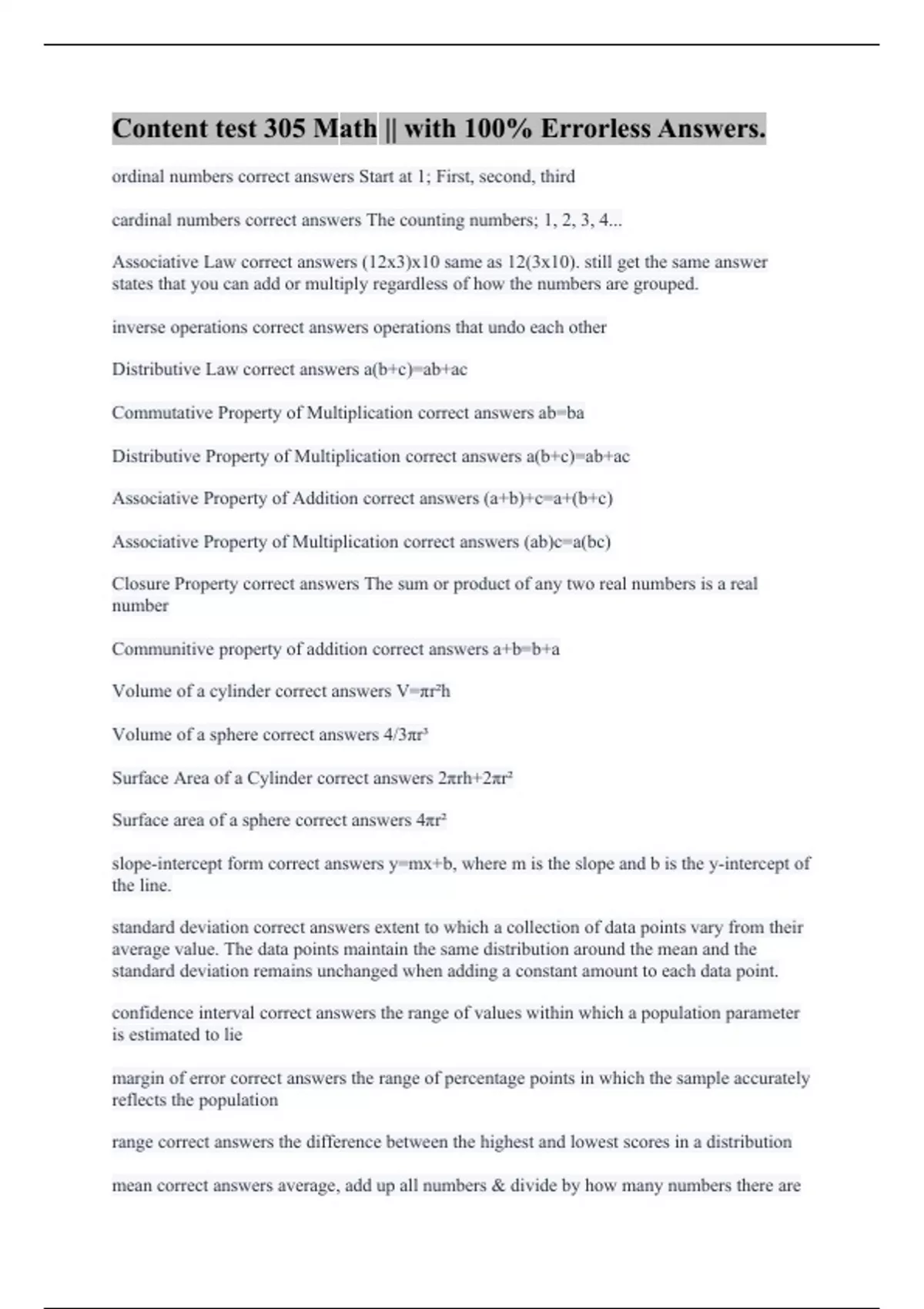 ordinal numbers correct answers Start at 1; First, second, third cardinal numbers correct answers The counting numbers; 1, 2, 3, 4... Associative Law correct answers (12x3)x10 same as 12(3x10). still get the same answer states that you can add or multiply regardless of how the numbers are grouped. inverse operations correct answers operations that undo each other Distributive Law correct answers a(b+c)=ab+ac Commutative Property of Multiplication correct answers ab=ba Distributive Property of Multiplication correct answers a(b+c)=ab+ac Associative Property of Addition correct answers (a+b)+c=a+(b+c) Associative Property of Multiplication correct answers (ab)c=a(bc) Closure Property correct answers The sum or product of any two real numbers is a real number Communitive property of addition correct answers a+b=b+a Volume of a cylinder correct answers V=πr²h Volume of a sphere correct answers 4/3πr³ Surface Area of a Cylinder correct answers 2πrh+2πr² Surface area of a sphere correct answers 4πr² slope-intercept form correct answers y=mx+b, where m is the slope and b is the y-intercept of the line. standard deviation correct answers extent to which a collection of data points vary from their average value. The data points maintain the same distribution around the mean and the standard deviation remains unchanged when adding a constant amount to each data point. confidence interval correct answers the range of values within which a population parameter is estimated to lie margin of error correct answers the range of percentage points in which the sample accurately reflects the population range correct answers the difference between the highest and lowest scores in a distribution mean correct answers average, add up all numbers & divide by how many numbers there are