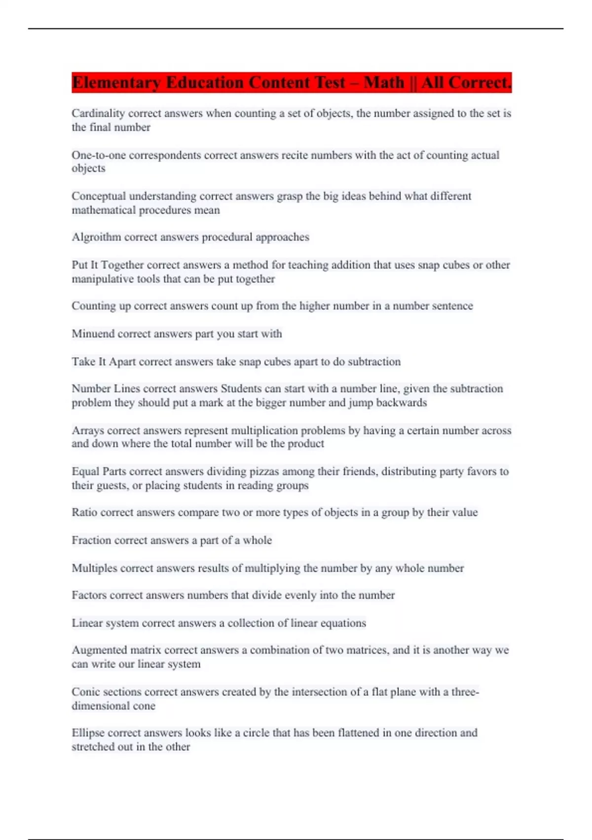 Elementary Education Content Test – Math || All Correct.