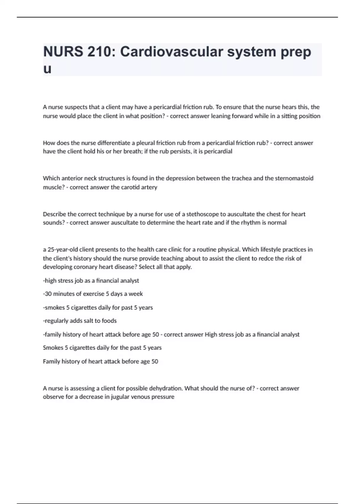 NURS 210: Cardiovascular system prep u A nurse suspects that a client may have a pericardial friction rub. To ensure that the nurse hears this, the nurse would place the client in what position? - correct answer leaning forward while in a sitting position How does the nurse differentiate a pleural friction rub from a pericardial friction rub? - correct answer have the client hold his or her breath; if the rub persists, it is pericardial Which anterior neck structures is found in the depression between the trachea and the sternomastoid muscle? - correct answer the carotid artery Describe the correct technique by a nurse for use of a stethoscope to auscultate the chest for heart sounds? - correct answer auscultate to determine the heart rate and if the rhythm is normal a 25-year-old client presents to the health care clinic for a routine physical. Which lifestyle practices in the client's history should the nurse provide teaching about to assist the client to redce the risk of developing coronary heart disease? Select all that apply. -high stress job as a financial analyst -30 minutes of exercise 5 days a week -smokes 5 cigarettes daily for past 5 years -regularly adds salt to foods -family history of heart attack before age 50 - correct answer High stress job as a financial analyst Smokes 5 cigarettes daily for the past 5 years Family history of heart attack before age 50 A nurse is assessing a client for possible dehydration. What should the nurse of? - correct answer observe for a decrease in jugular venous pressure